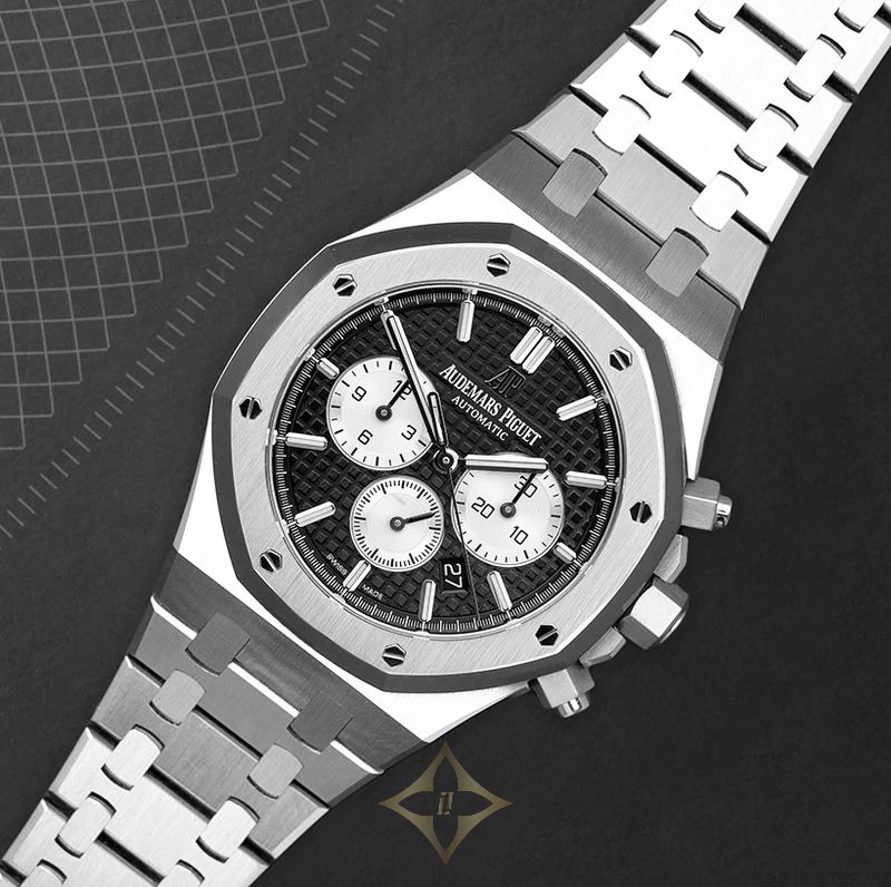 The elegant blackdial is adorned with the signature "Grande Tapisserie" pattern, providing a textured backdrop that enhances the visual appeal. The black chronograph sub-dials at 3, 6, and 9 o'clock offer a sharp contrast, aiding in easy readability and lending the watch its sophisticated charm. The dial also features a date window positioned discreetly between 4 and 5 o'clock. White gold applied hour-markers and Royal Oak hands with luminescent coating ensure visibility in all lighting conditions.