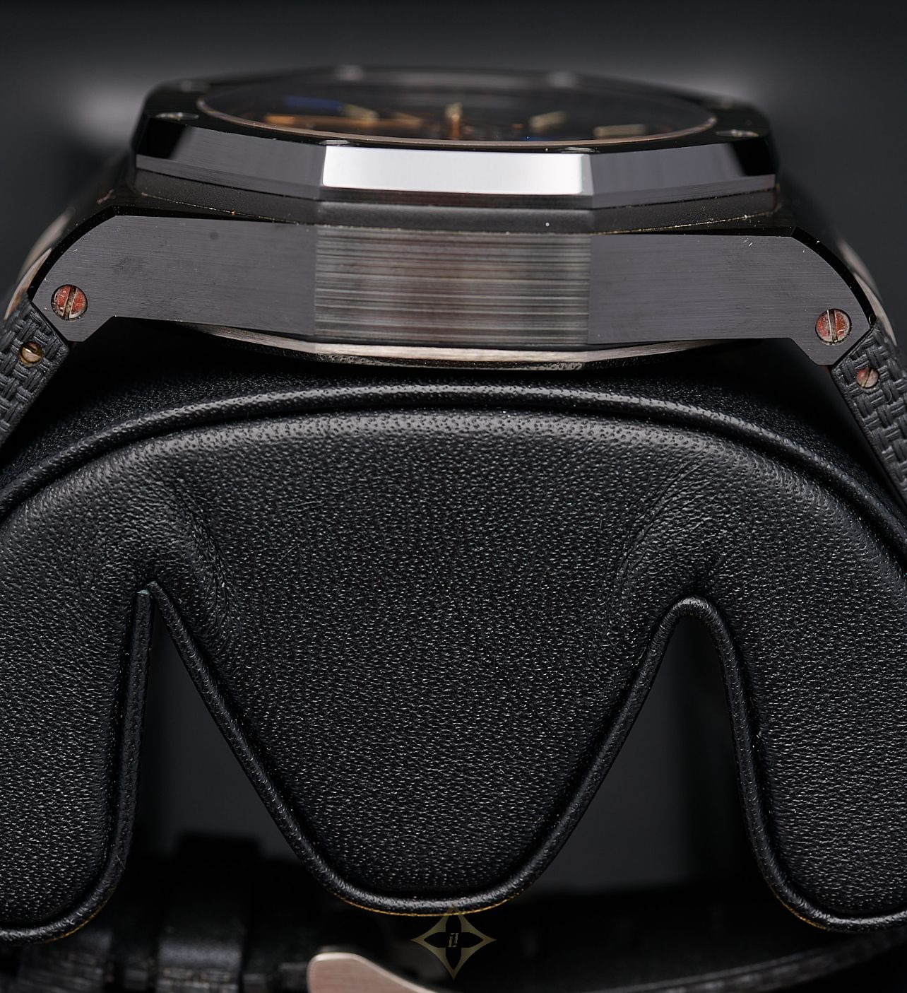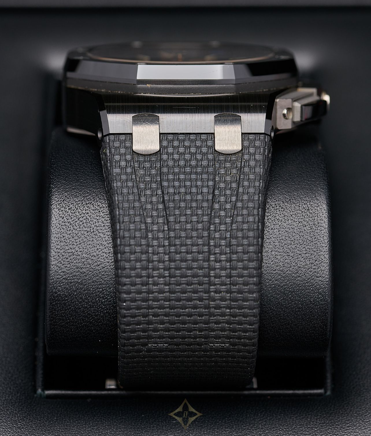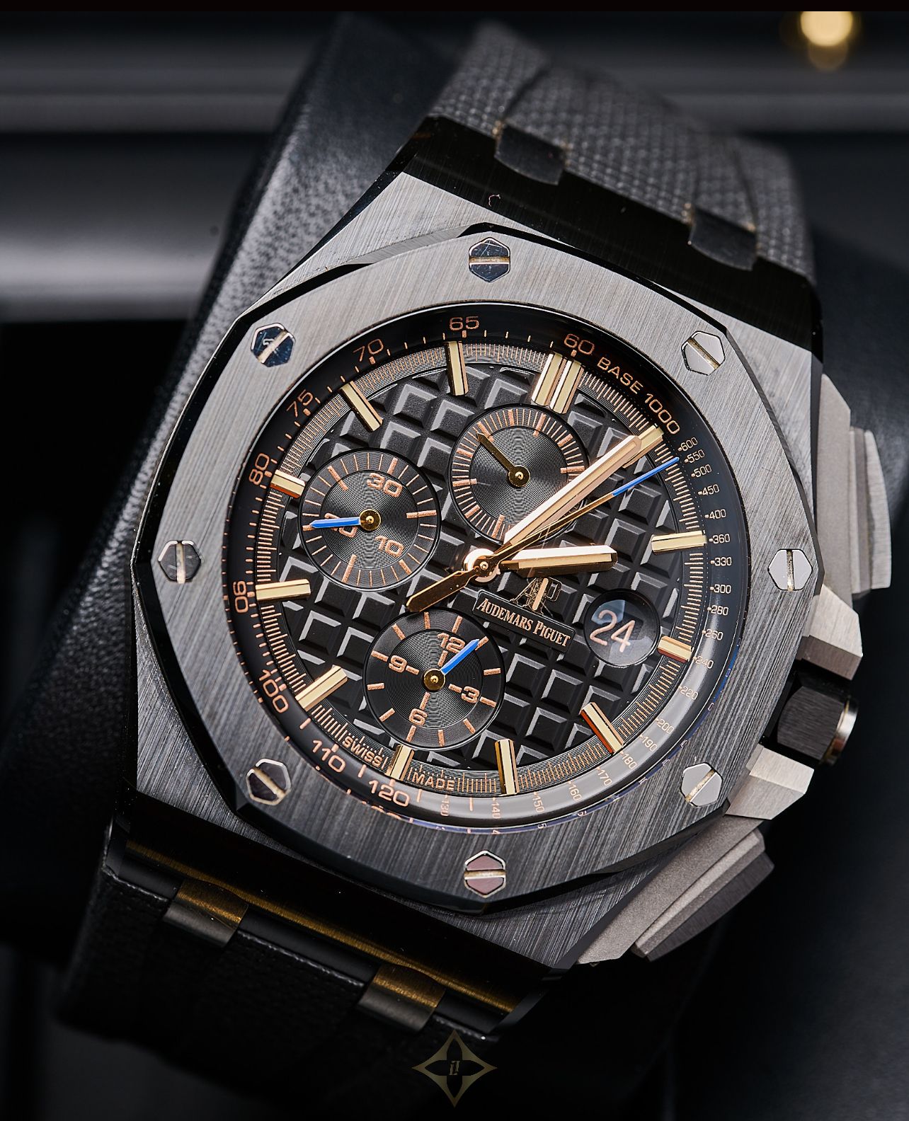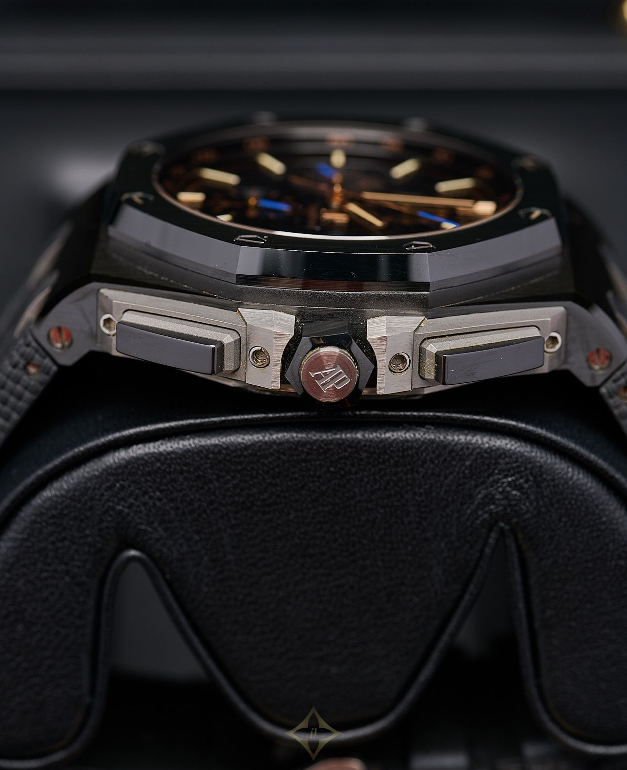This is the Audemars Piguet Royal Oak Offshore Chronograph Ref. 26405CE.OO.A002CA.02, a standout 44mm model crafted in full black ceramic and complemented by a black “Méga Tapisserie” dial accented with rose gold applied hour markers and hands. This configuration creates a sophisticated contrast, balancing the rugged matte ceramic with luxurious warm tones.