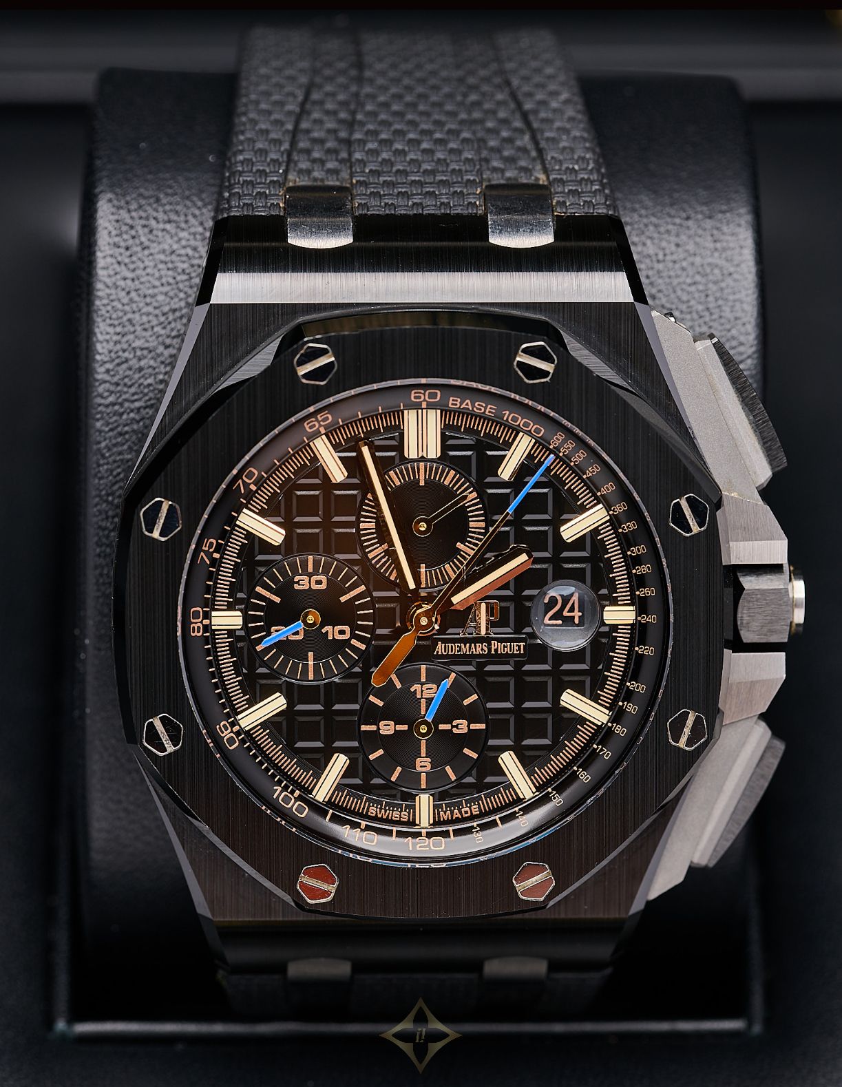 AP Royal Oak Offshore 26405CE – 44mm full black ceramic chronograph with smoked dial.