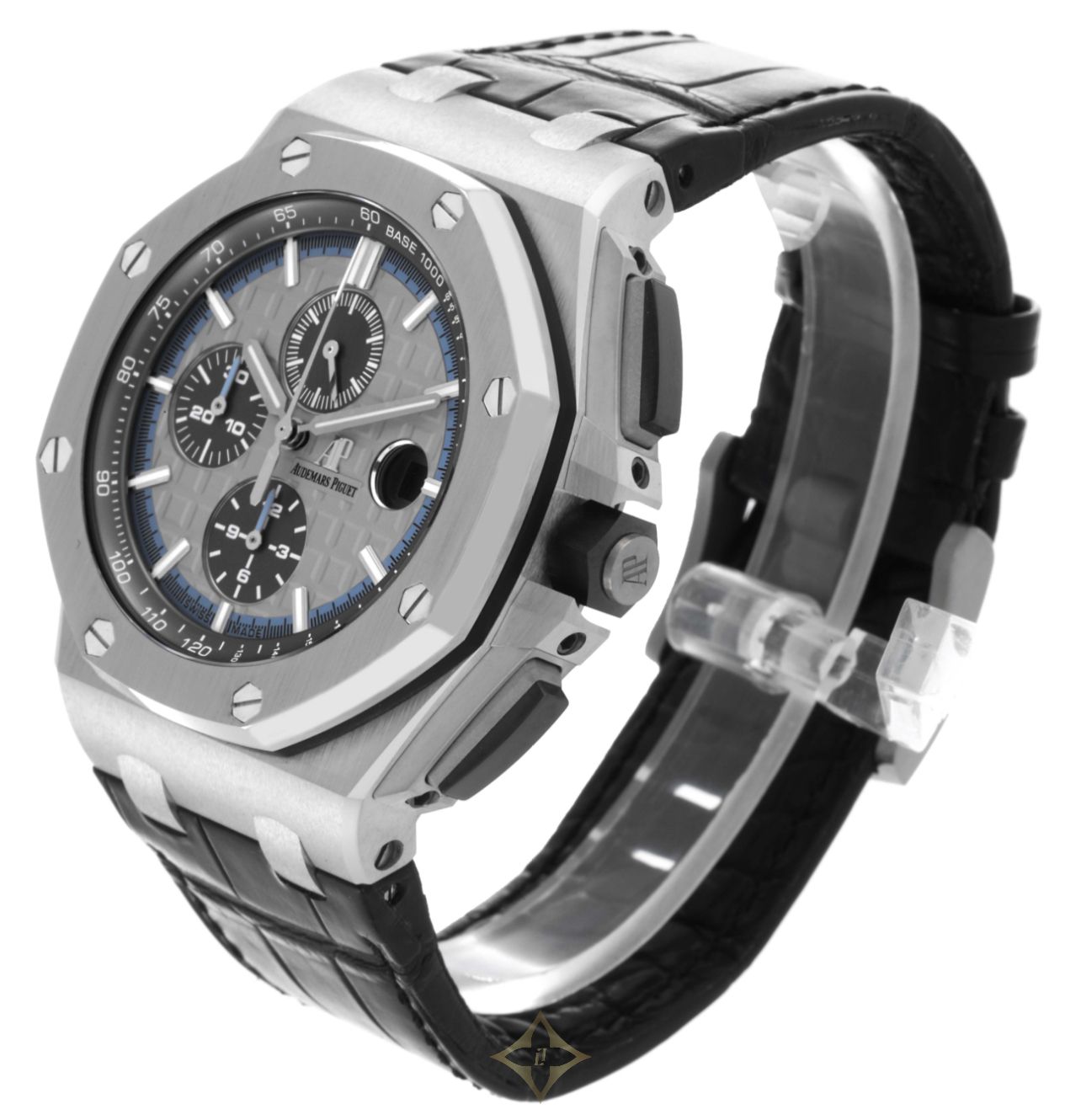 Case: 18k white gold octagonal case 44.0 mm in diameter. Two pushers operate the chronograph functions. Audemars Piguet logo on the crown.