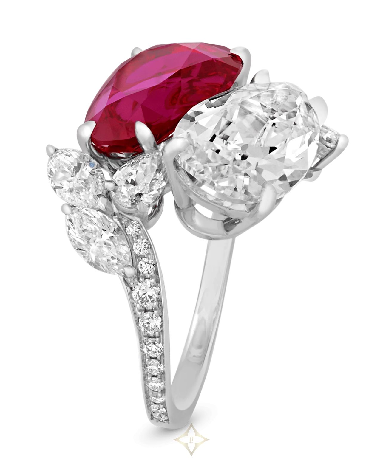 This ring pairs two exceptionally rare gems working together in perfect harmony—the pièce de résistance of any collection. The stunning, unheated Burma ruby weighs 5.70 carats, and the remarkable Type IIa Golconda diamond weighs a breathtaking 4.54 carats. Individually these stones represent the finest of their kind, coalescing here into a truly extraordinary duo.