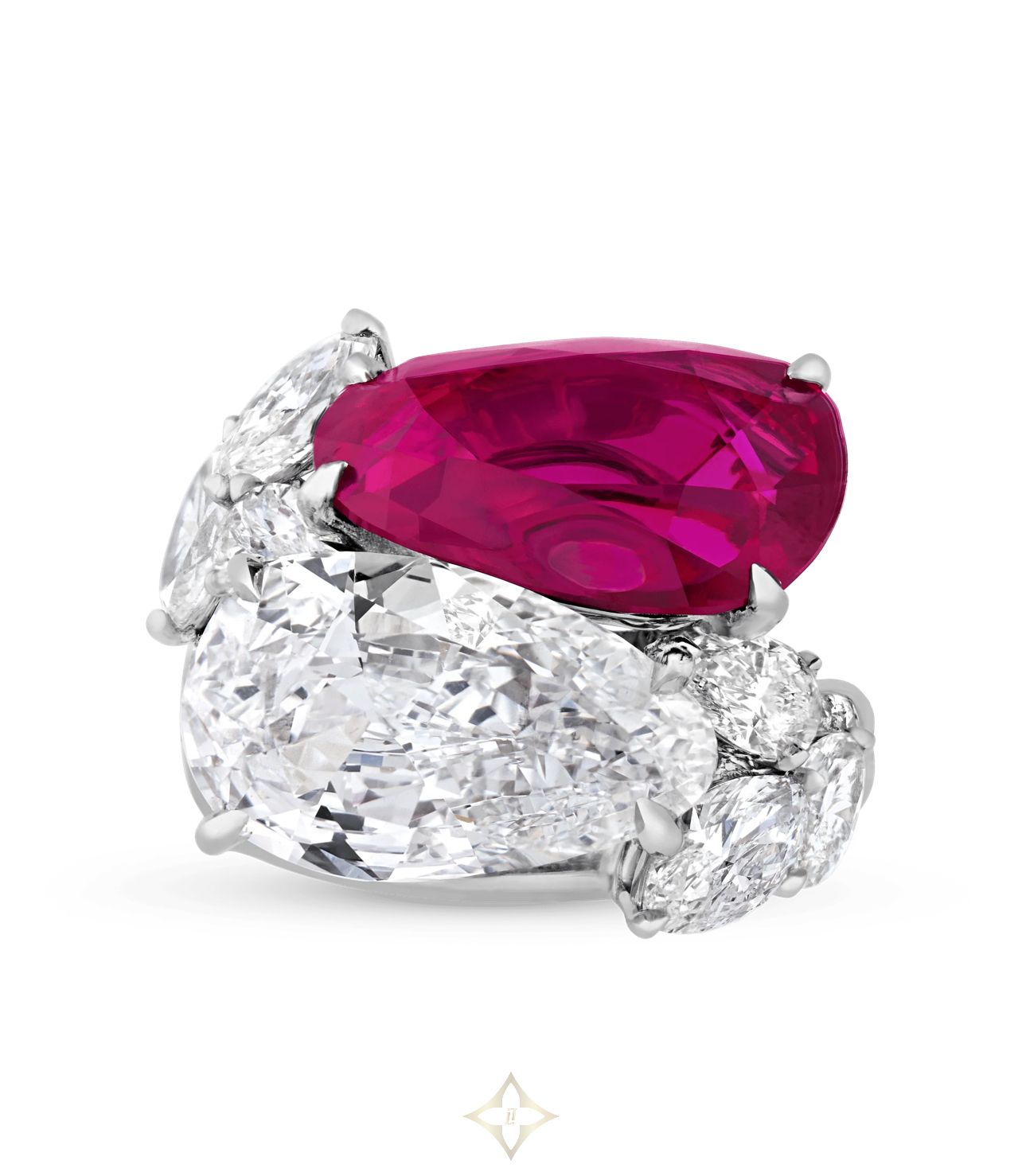 An exquisite 5.70-carat ruby and 4.54-carat diamond are perfectly matched in this ring