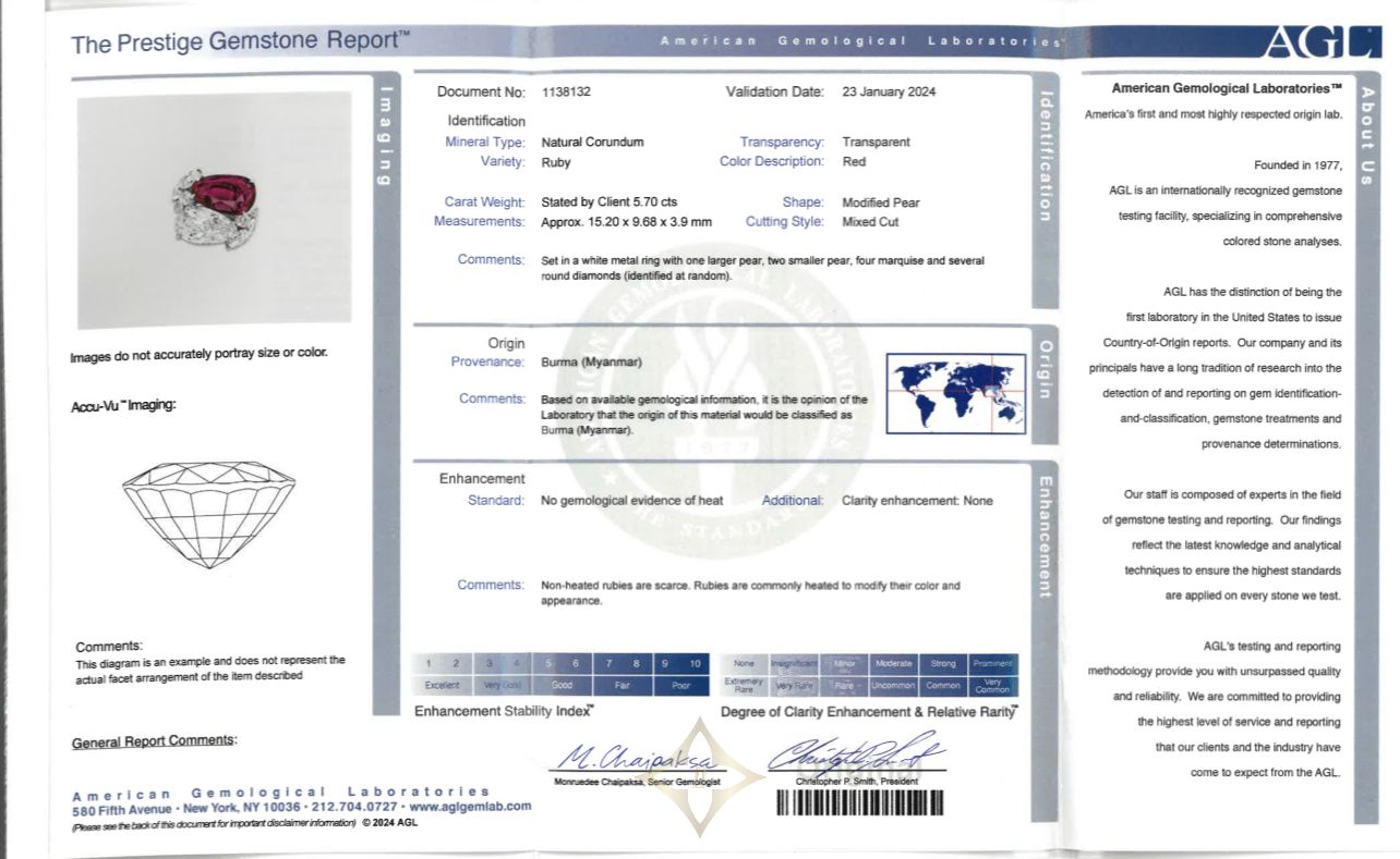 Both the Burma ruby and Golconda diamond are certified by the AGL and GIA
