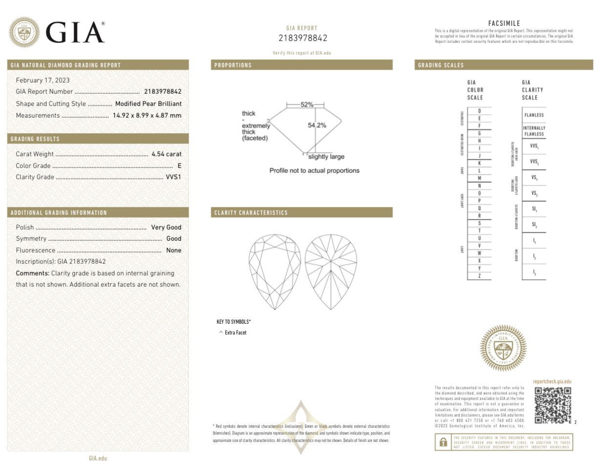 The matching pear-shaped Golconda diamond is equally remarkable, certified by the Gemological Institute of America as a highly desirable type IIa diamond with VVS1 clarity. As the GIA notes in its accompanying letter, "Type IIa diamonds are the most chemically pure type of diamond and often have exceptional optical transparency." Together, the jewels create a unique and stunning interplay in their classic platinum setting, accented by 1.50 carats of marquise, pear and round cut white diamonds.