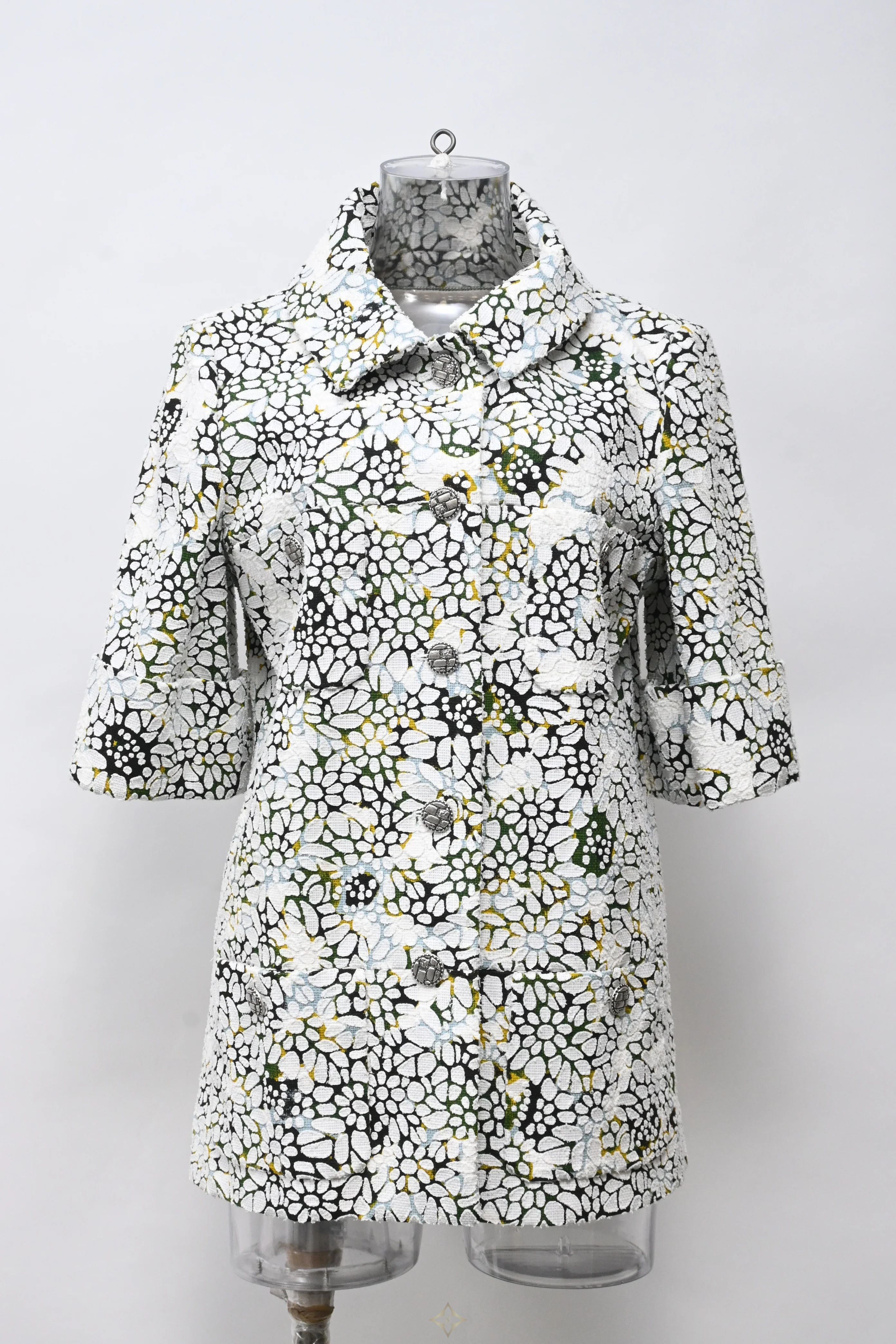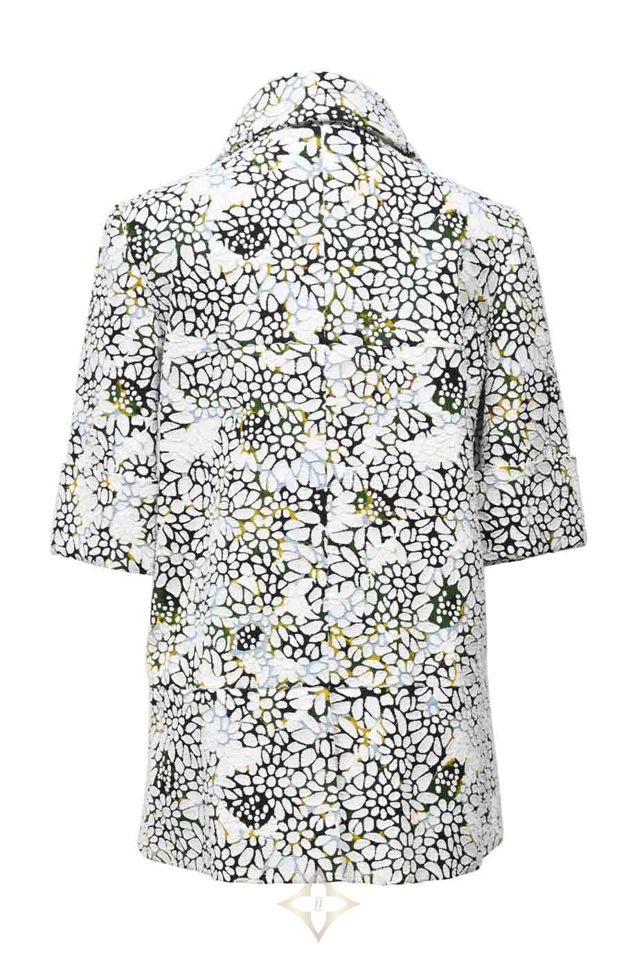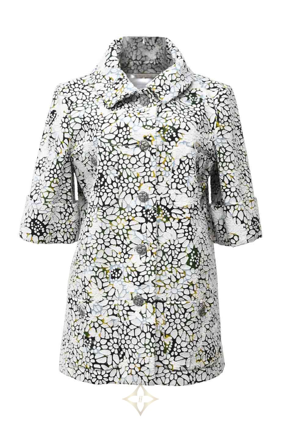 Green and white cotton single breasted collared overshirt jacket featuring half sleeves and graphic floral motif
