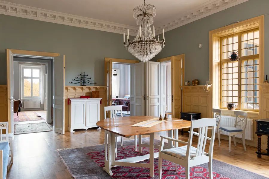 A breathtaking, stately apartment dating from 1887, situated in a high and secluded position, adjacent to Humlegården. The apartment retains period features from its year of construction, such as richly detailed stucco, door pediments, French double doors, panelling with deep reveals, French wall panelling and elegant star-patterned parquet flooring. Welcoming entrance hall including a large west-facing balcony. Four social rooms enfilade, boasting far-reaching views over Humlegården as well as parquet flooring and tiled stoves in every room. Four to five bedrooms. You will find three entrances in total, offering the possibility of dividing the property for multi-generational living or an au pair. Part of the apartment can be separated and used as an independent unit.