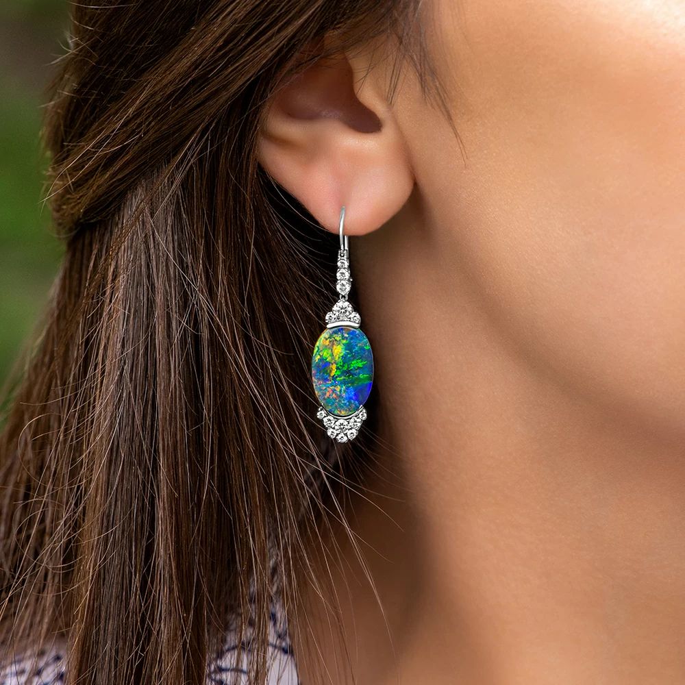 Custom Black Opal Earrings STYLE NO: 162485 These Wixon custom earrings feature a remarkable pair of perfectly matched black opals, totaling 9.62 carats total weight. Round brilliant diamonds trace the border of the rare multi-hued gemstones, highlighting the broadflash pattern that encompasses all the colors of the rainbow. The diamonds delicately ascend the platinum posts to provide detailed ornamentation throughout the earrings entirety. PRICE: $54,500 Originally $99,000 ——— WIXON JEWELERS