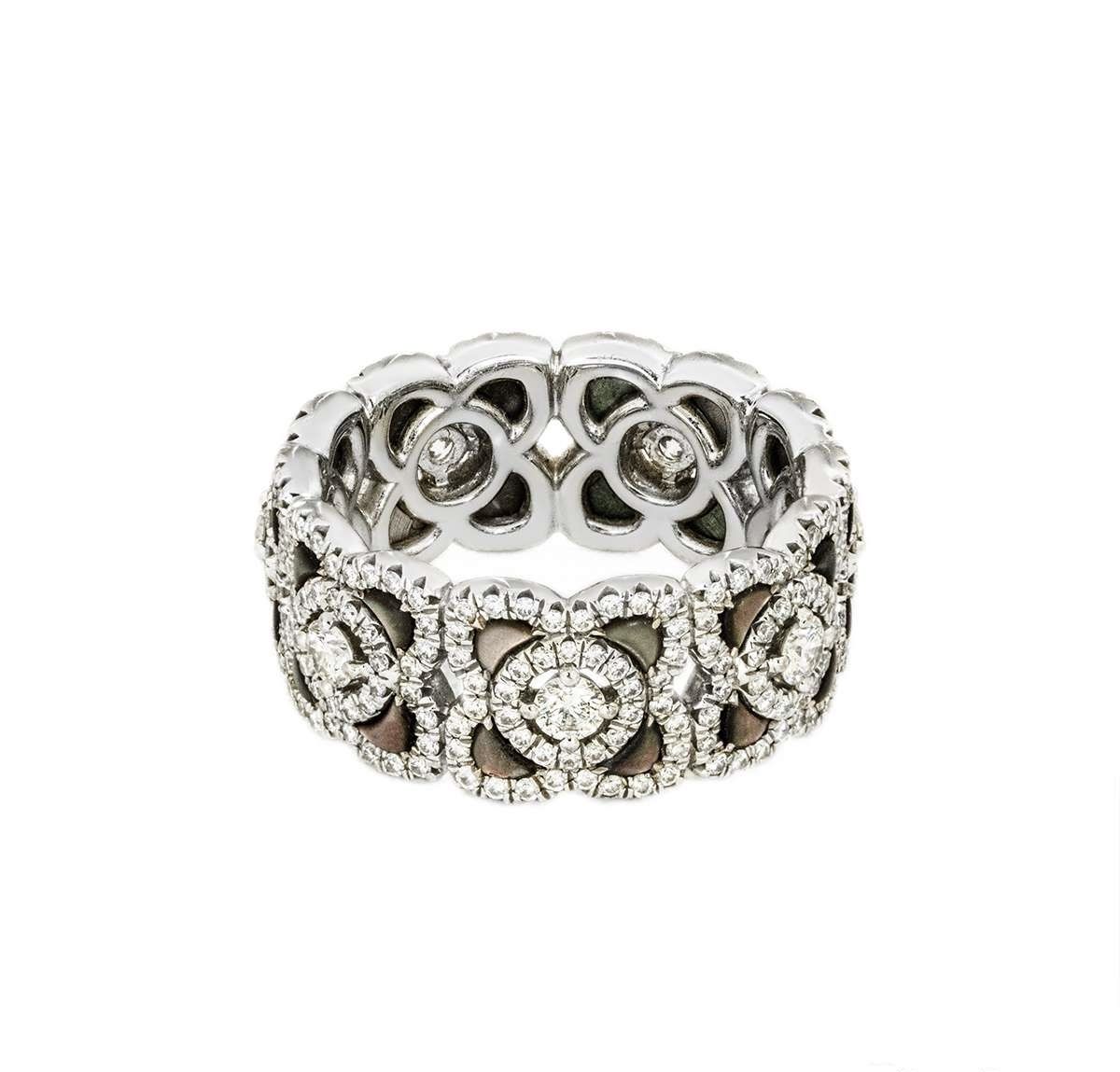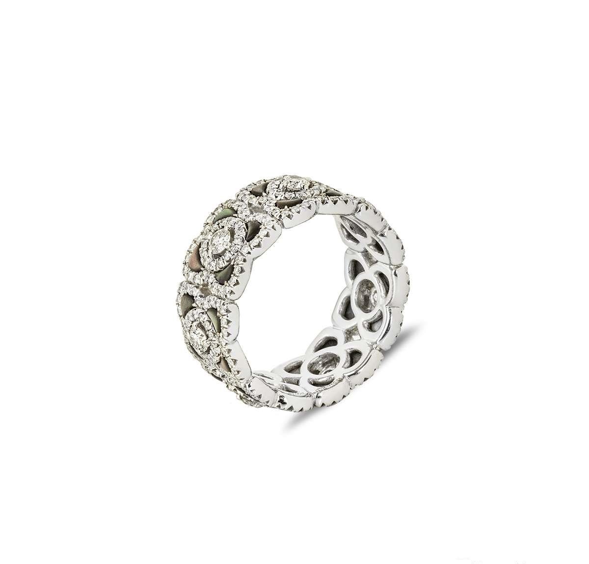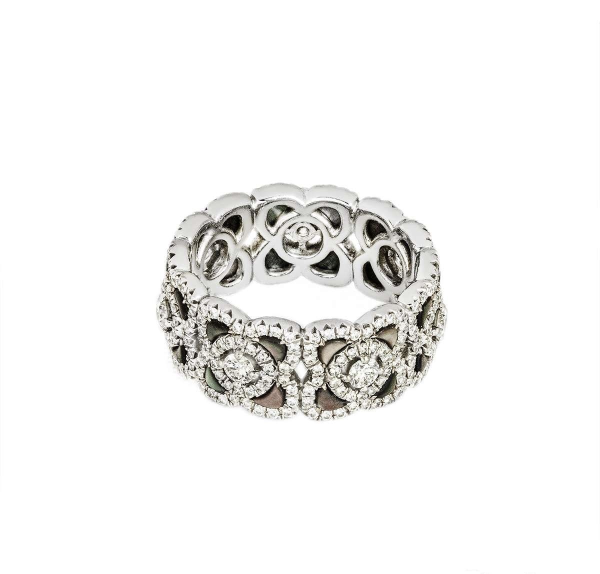 De Beers White Gold Diamond & Black Mother Of Pearl Enchanted Lotus Ring Size 49 PRICE: £ 4,250 UK J - EU 49 Available MINT (Pre-owned) DETAILS An elegant 18k white gold diamond and black mother of pearl ring by De Beers from the Enchanted Lotus collection. The band is set with 7 lotus motifs with mother of pearl inlays, pave set throughout with 301 round brilliant cut diamonds with an approximate total weight of 1.26ct, E-G colour and VS clarity. The 8mm wide ring is a size J and has a gross weight of 7.3 grams. Comes complete with a De Beers box and our own certificate of authenticity. ——— Rich Diamonds VAT Registration No. GB140533939 Company number 07598033 74 New Bond St, London W1S 1RT, United Kingdom