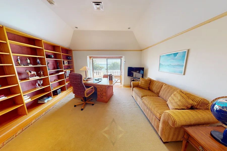 There are five bedrooms in total; with four located in west wing. The Primary bedroom is the perfect sanctuary with fireplace and sliding doors leading out to a stone covered patio where one can take in the beautiful views and be lulled by the tranquil sounds of the ocean. Sophisticated finishes such as marble flooring, large marble bathroom and cedar-lined walk-in closets complete this haven. The additional three bedrooms in the west wing, all ensuite, offer impressive living spaces; two with ocean views and one with lush garden views. The fifth bedroom, also ensuite, currently used as an executive office is located in the east wing. Upon entering your first impression is one of warmth and relaxation as you are surrounded by built-in bookshelves, wood flooring and spectacular ocean views. Take the spiral staircase down to the spacious media room complete with a media closet, full bath, and sliding doors that lead directly out to the swimming pool.