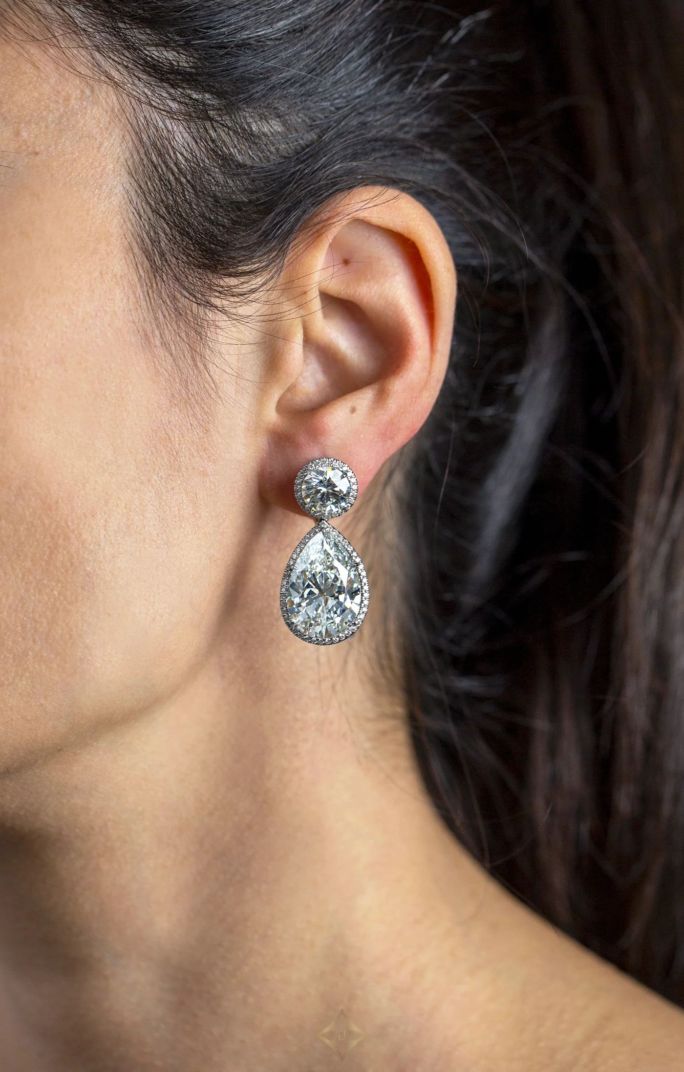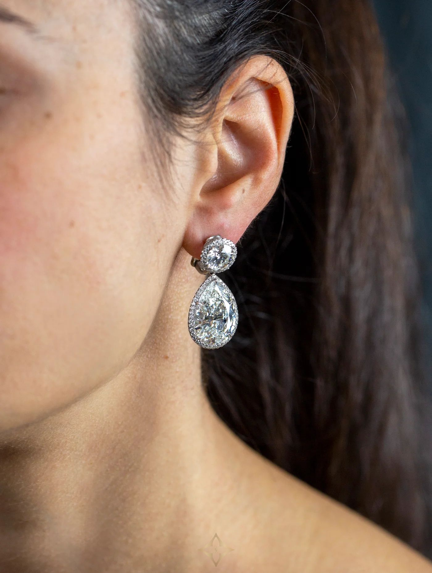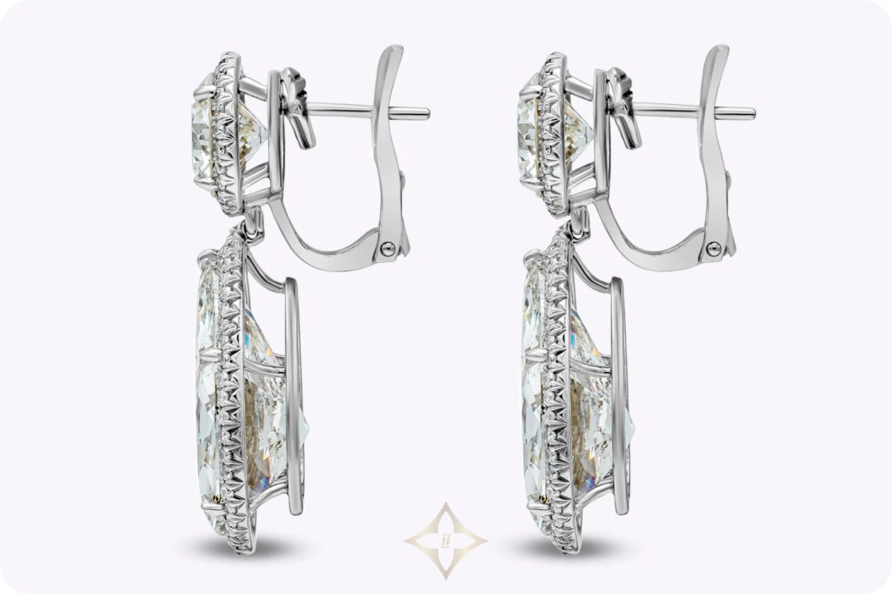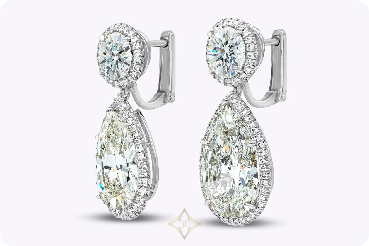 GIA Certified 29.54 Carats Total Pear Shape & Round Cut Diamond Dangle Earrings in Platinum | New York 🇺🇸