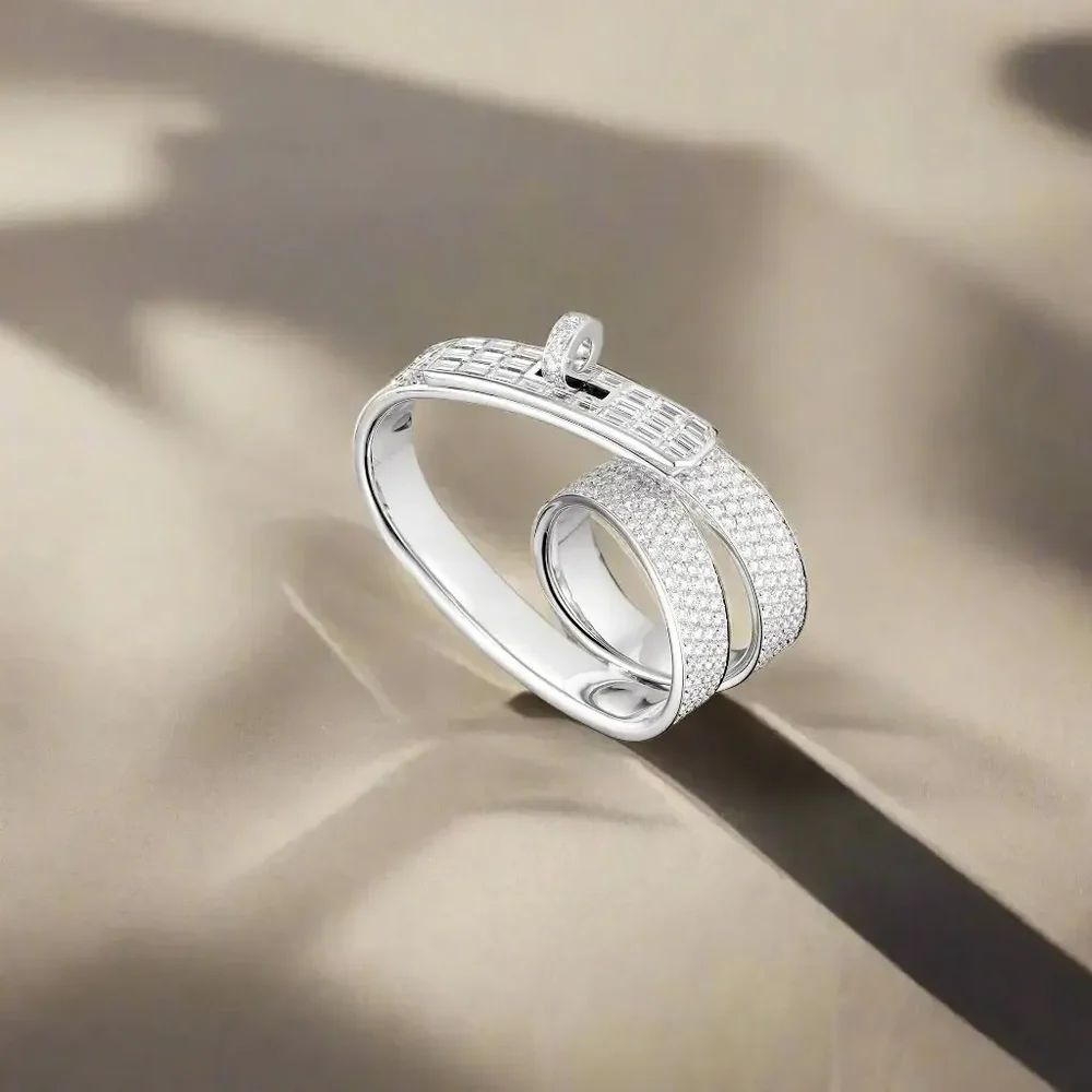 The Hermès Kelly Gavroche Double Ring is a luminous tribute to the house’s legendary design heritage. Forged in solid 18K white gold (Au 750), this double-band ring showcases a refined architectural silhouette, where one polished band seamlessly interlocks with a second, fully pavé-set in 258 brilliant white diamonds totaling 3.19 carats.