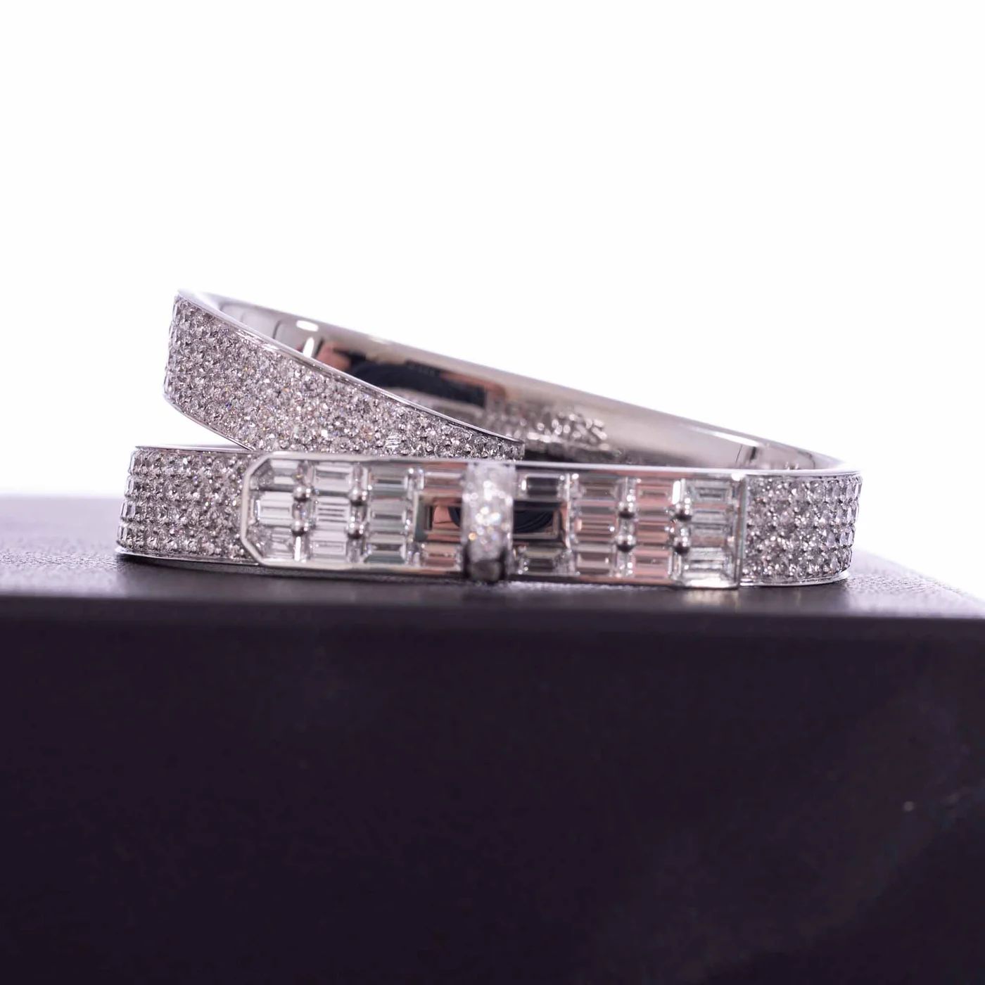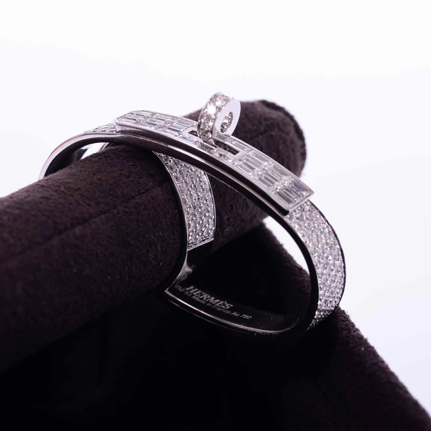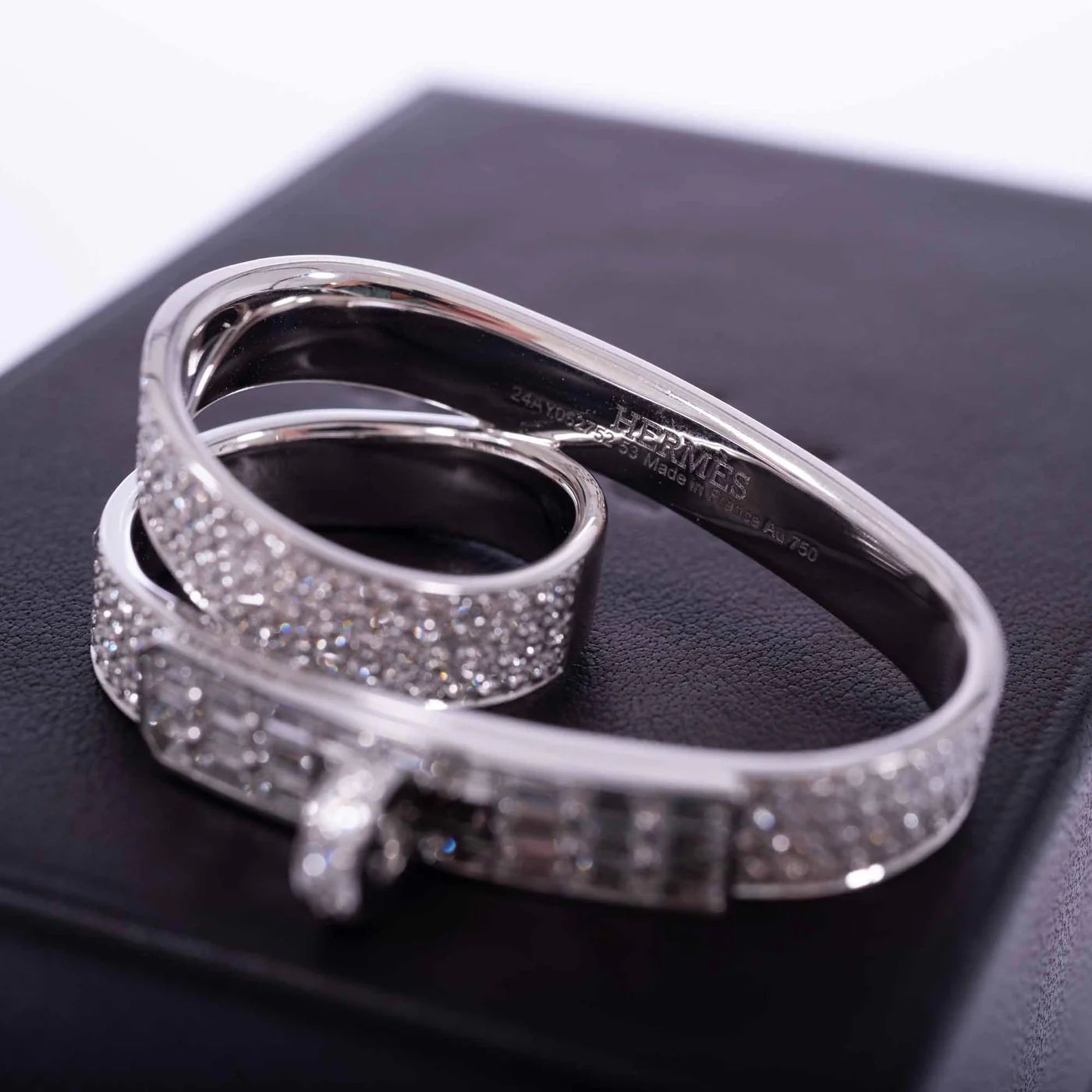 At its center, a miniature reinterpretation of the iconic Kelly closure links the two rings, a sculptural and symbolic gesture to the maison’s leather-making legacy. Each stone is graded VVS in clarity and F–G in color, chosen for its exceptional brilliance and set with meticulous precision by Hermès Joaillerie artisans.