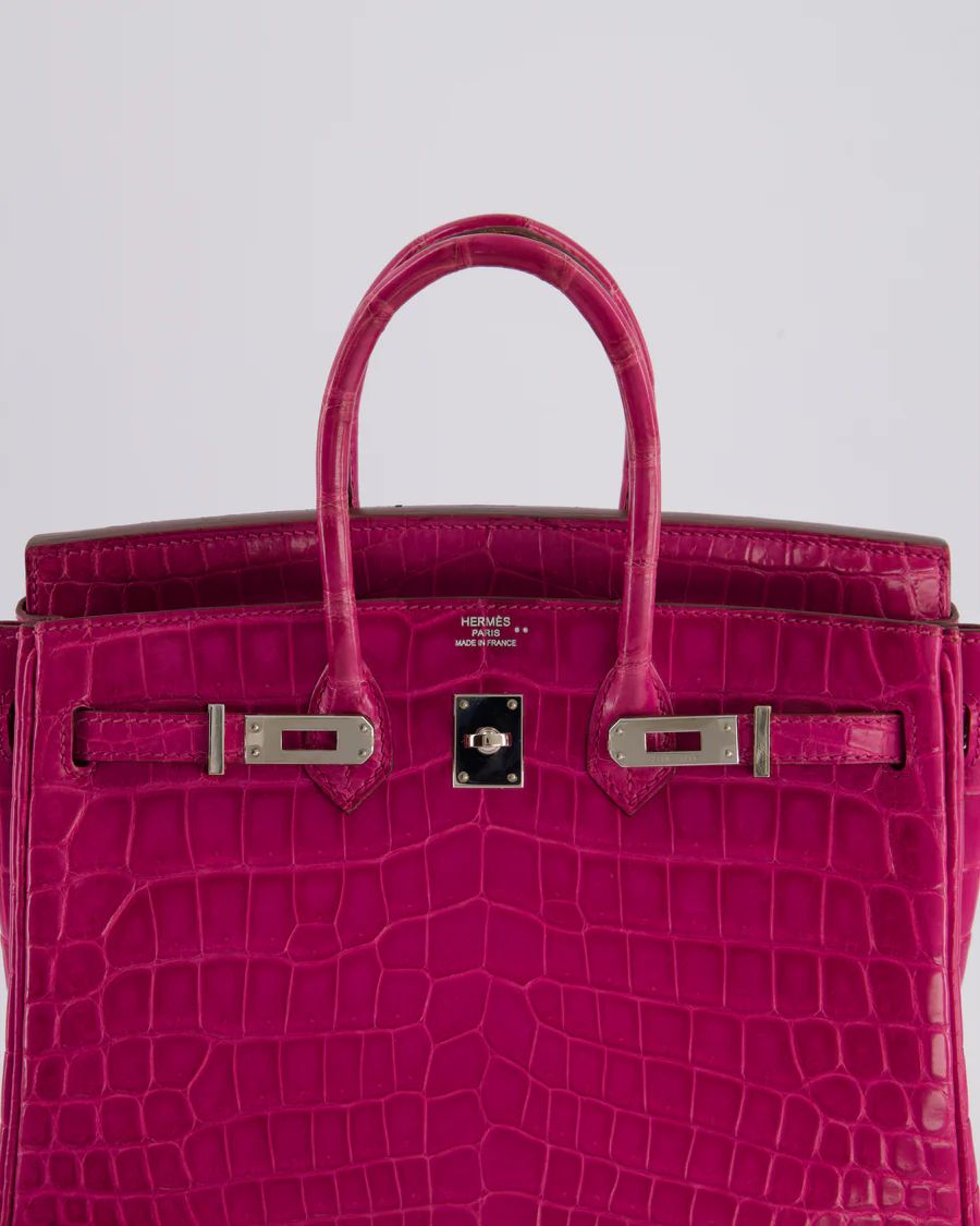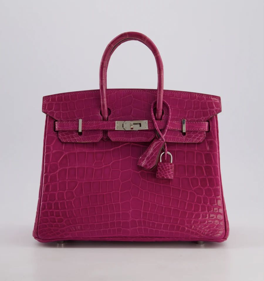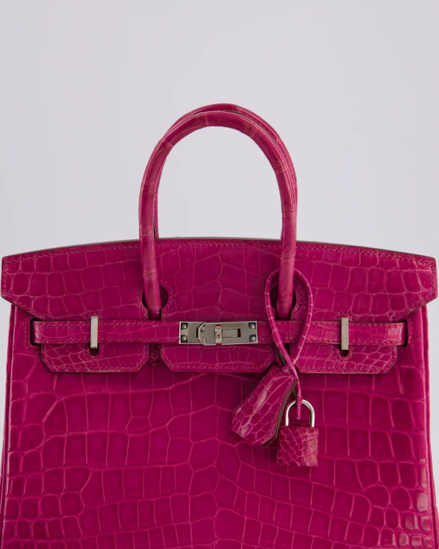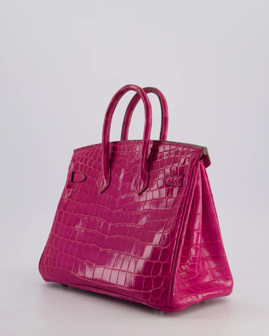 *RARE* HERMÈS BIRKIN 25 RETOURNE BAG IN ROSE SCHEHERAZADE NILOTICUS POROSUS WITH PALLADIUM HARDWARE PRICE: £43,450 *RARE* Hermès Birkin 25 Retourne Bag in Rose Scheherazade Niloticus Porosus with Palladium Hardware This bag is in excellent condition with light wear to the corners Please see all of the photos for more information on this item DETAILS Brand - Hermès Model - Birkin 25cm Materials - Niloticus Porosus Colour - Rose Scheherazade Hardware - Palladium Accompanied by the original dustbag, lock, key, clochette and Bababebi certificate Please note that this bag does not come with a CITES certificate Measurements – 25cm x 20cm x 13cm Year - 2013 Stamp - Q in a square Ref - 043462 We note that all packages sent out via DHL will arrive DDU, Delivery Duties Unpaid. Please note that all of our items are pre-owned unless stated otherwise. By purchasing through us, you are contributing to an ethical and sustainable fashion future. All of our items come with an authenticity guarantee, and all sales are final. For deliveries outside the UK and EU, items are shipped DDU (Delivered Duty Unpaid), meaning any applicable duties or taxes are the responsibility of the customer. You are making great choices for the planet and for yourself, Love Sellier. ——— SELLIER KNIGHTSBRIDGE 6 Cheval Place, London, SW7 1ES, United Kingdom Tel:  +44 20 7581 2380 Email: shop@sellierknightsbridge.com