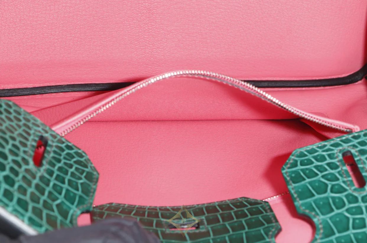 HERMES BIRKIN 30 PATCHWORK EMERALD GREEN, VERT TITIEN, VERT FONCE, MALACHITE, ROSE AZALEE INTERIOR, SILVER HARDWARE POROSUS, EPSOM, CHEVRE, CLEMENCE, BOX WITH DUST COVER