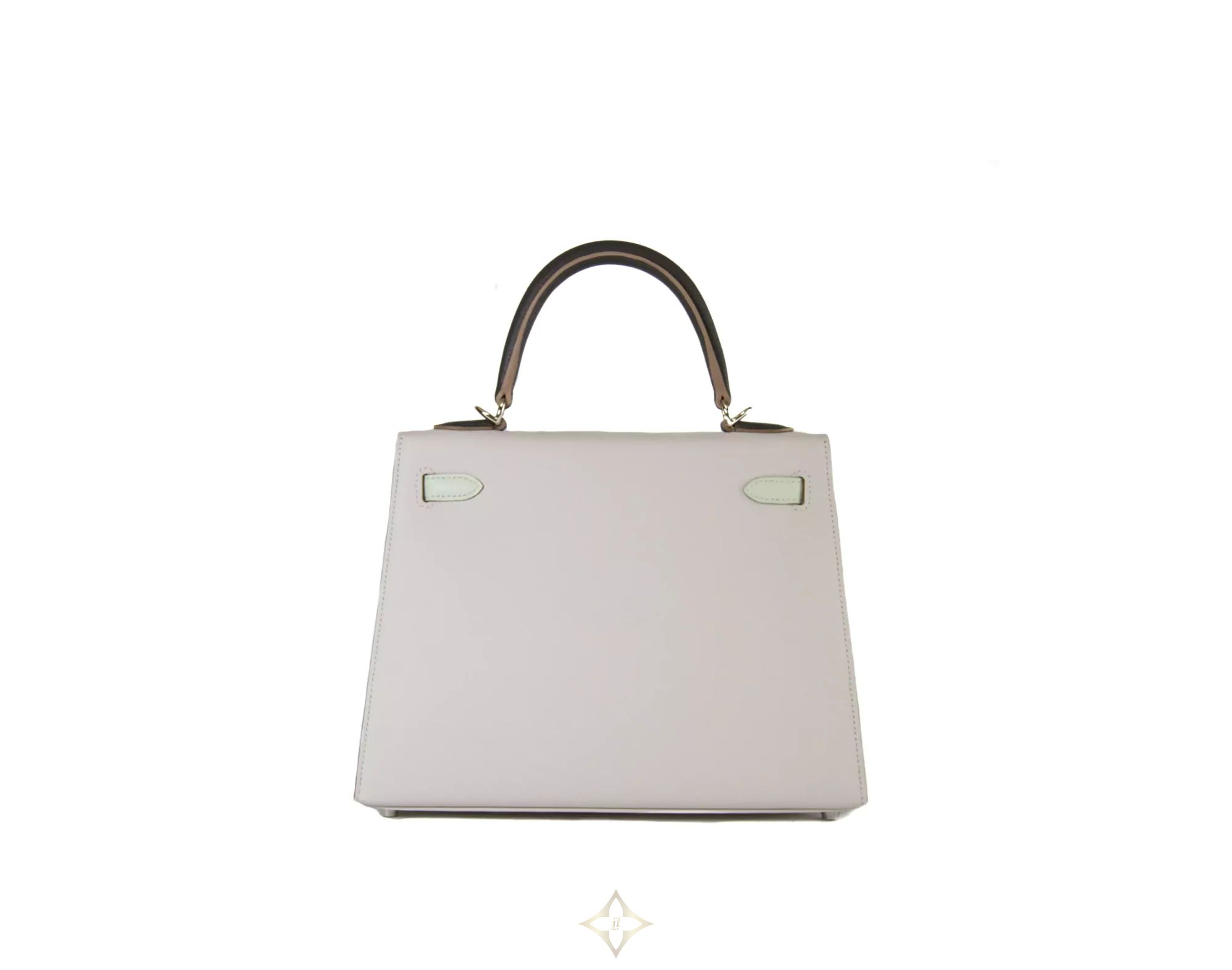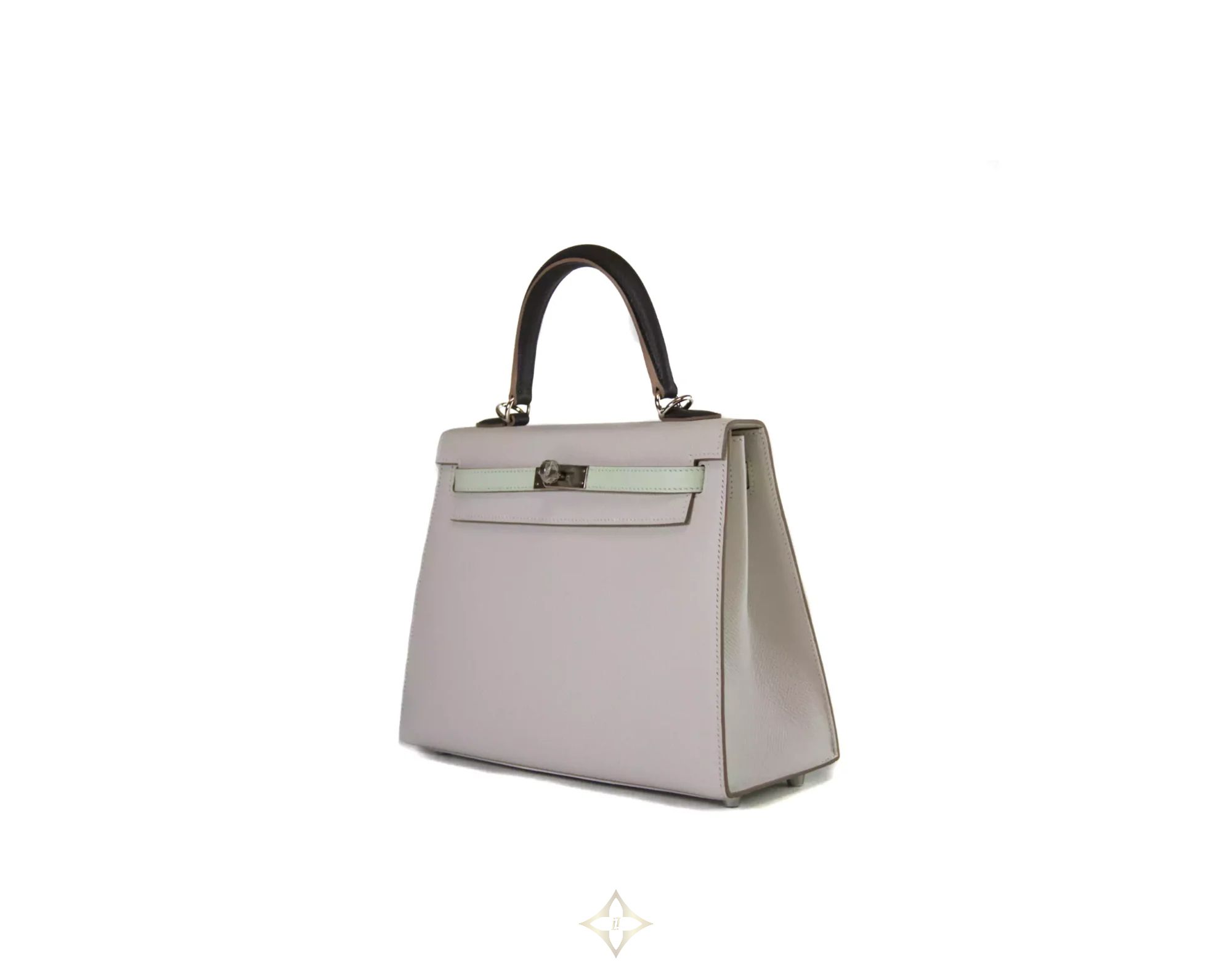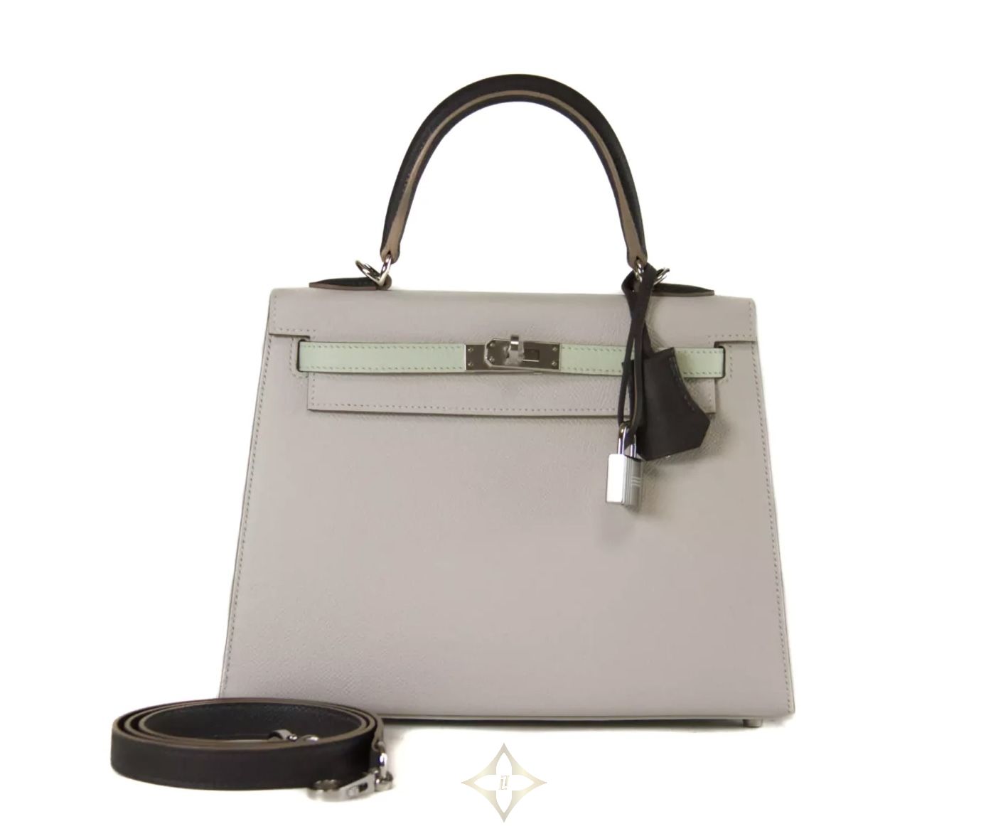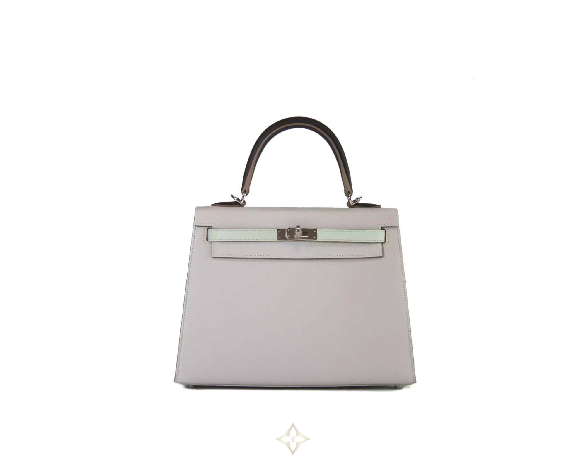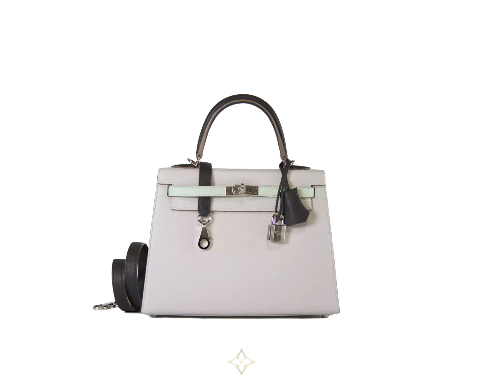 Hermès Kelly 25 Epsom Gris Pale / Vert Fizz / Graphite Palladium Hardware PRICE: 21.500,00 € Hermès Kelly 25 Epsom Gris Pale / Vert Fizz / Graphite with Palladium Hardware. This gorgeous Kelly 25 tricolore in Sellier style is an absolute eye-catcher. The silver hardware adds an extra dimension of elegance to the bag, while the durable Epsom leather provides both a luxurious feel and timeless aesthetics. The Kelly 25 Bag is perfect for those who appreciate the finer details. With its compact size, it's the ideal companion for special occasions or as a stylish accessory for everyday use. Whether as a special gift or a statement piece for your individual style – this Kelly 25 Bag will perfect your look in a subtle way. The Hermès Kelly Bag is not just an accessory, but a symbol of elegance and class that has shaped the world of high fashion for decades. The Hermès Kelly 25 tricolore bag is in a brand new condition, the original invoice dated 2024 is included. Investing in a Hermès Kelly Sellier Tricolore is an investment in a piece of fashion history. PRODUCT SPECIFICATION Material: Epsom leather Colour: Gris Pale / Vert Fizz / Graphite Metal elements: Palladium Hardware Inner material: Leather Grade: 1 info box Year of production/Stamp: 2024 / B Size: 25 x 19 x 9 cm Shipping: Worldwide Includes: Original receipt, dust bag, strap, clochette, lock, keys, felt, booklet, box ——— Handbag Spa & Shop Leibnizstraße 59, 10629 Berlin, Germany E-mail: info@handbag-sense.com Phone: +49 30 554 69 475 WhatsApp: +49 174 178 02 75