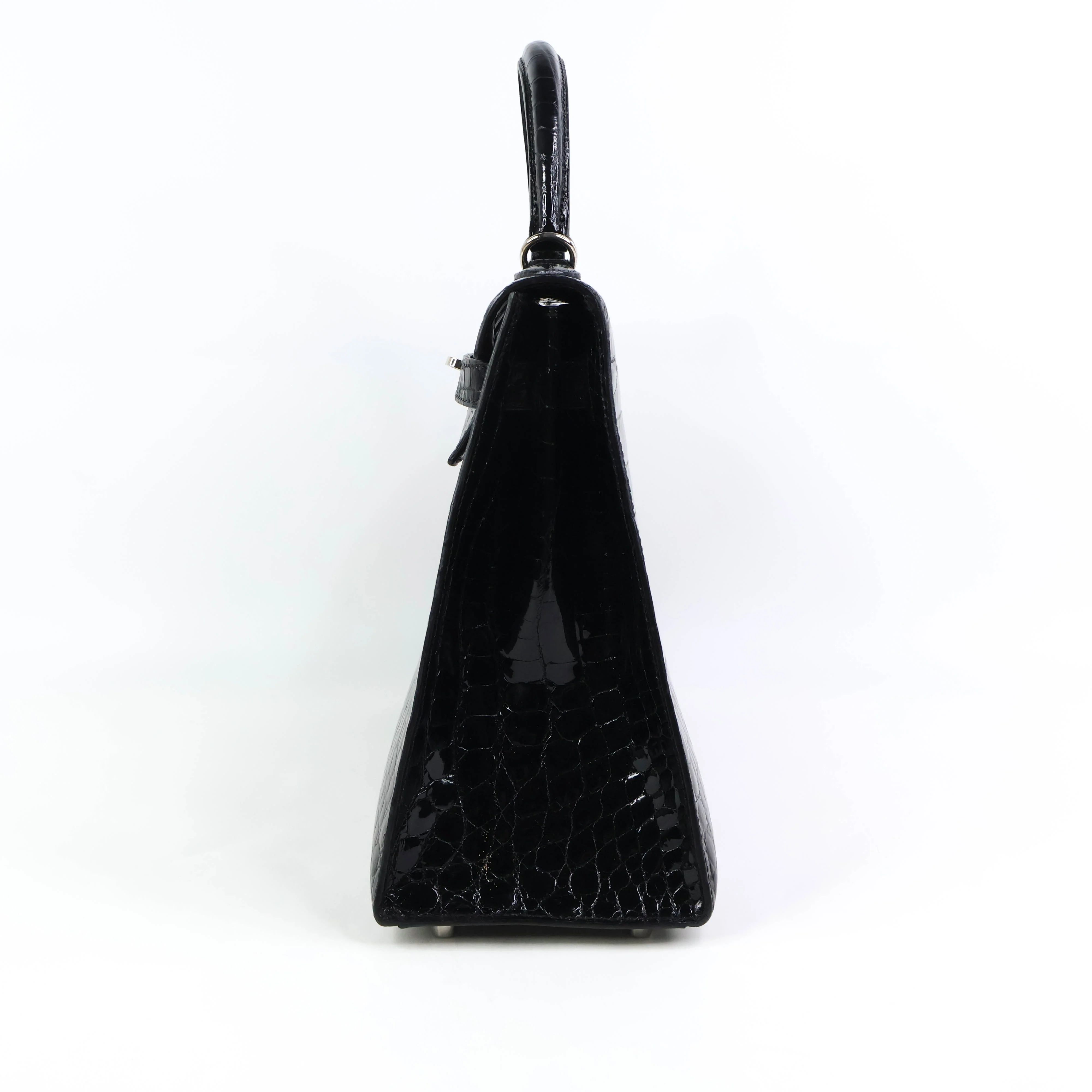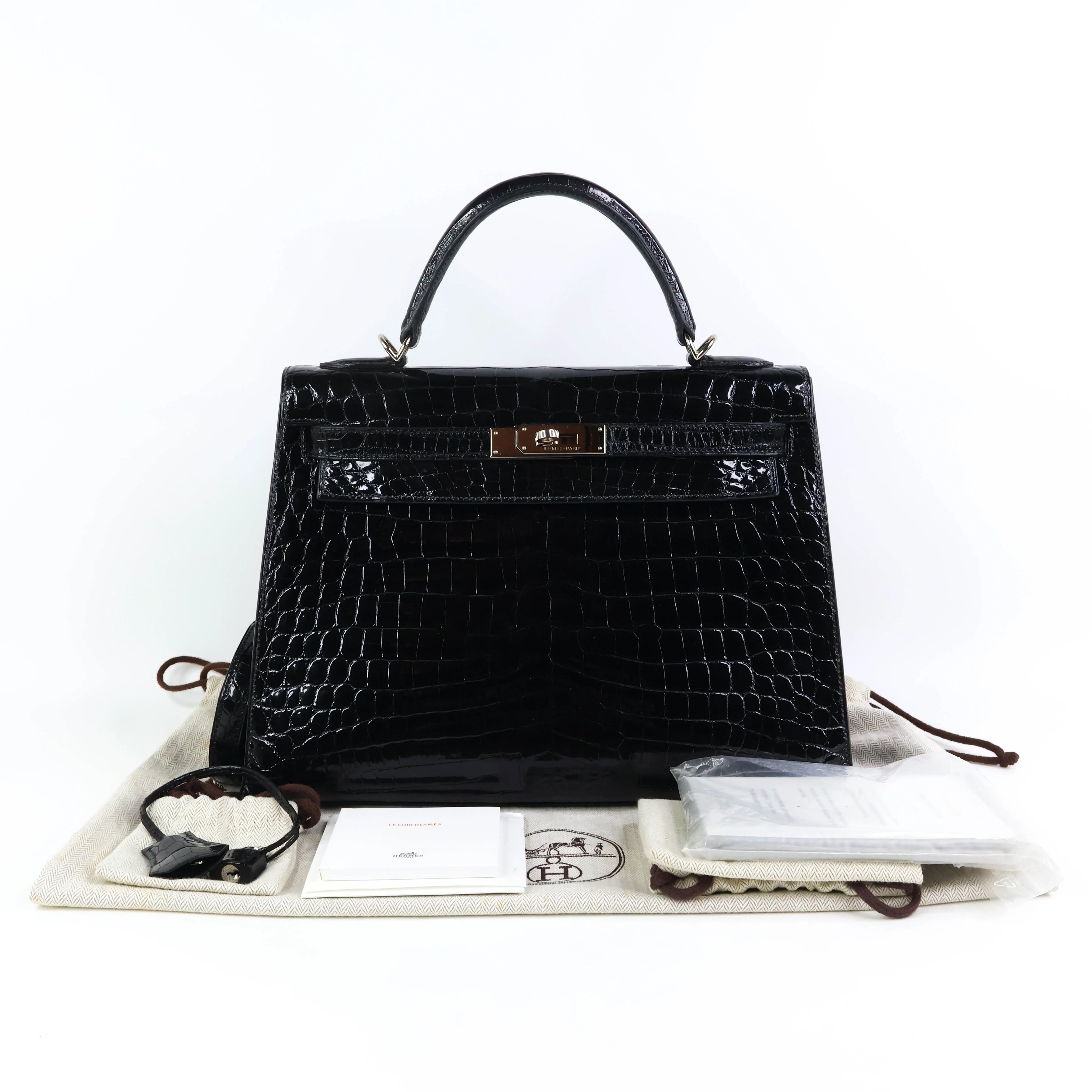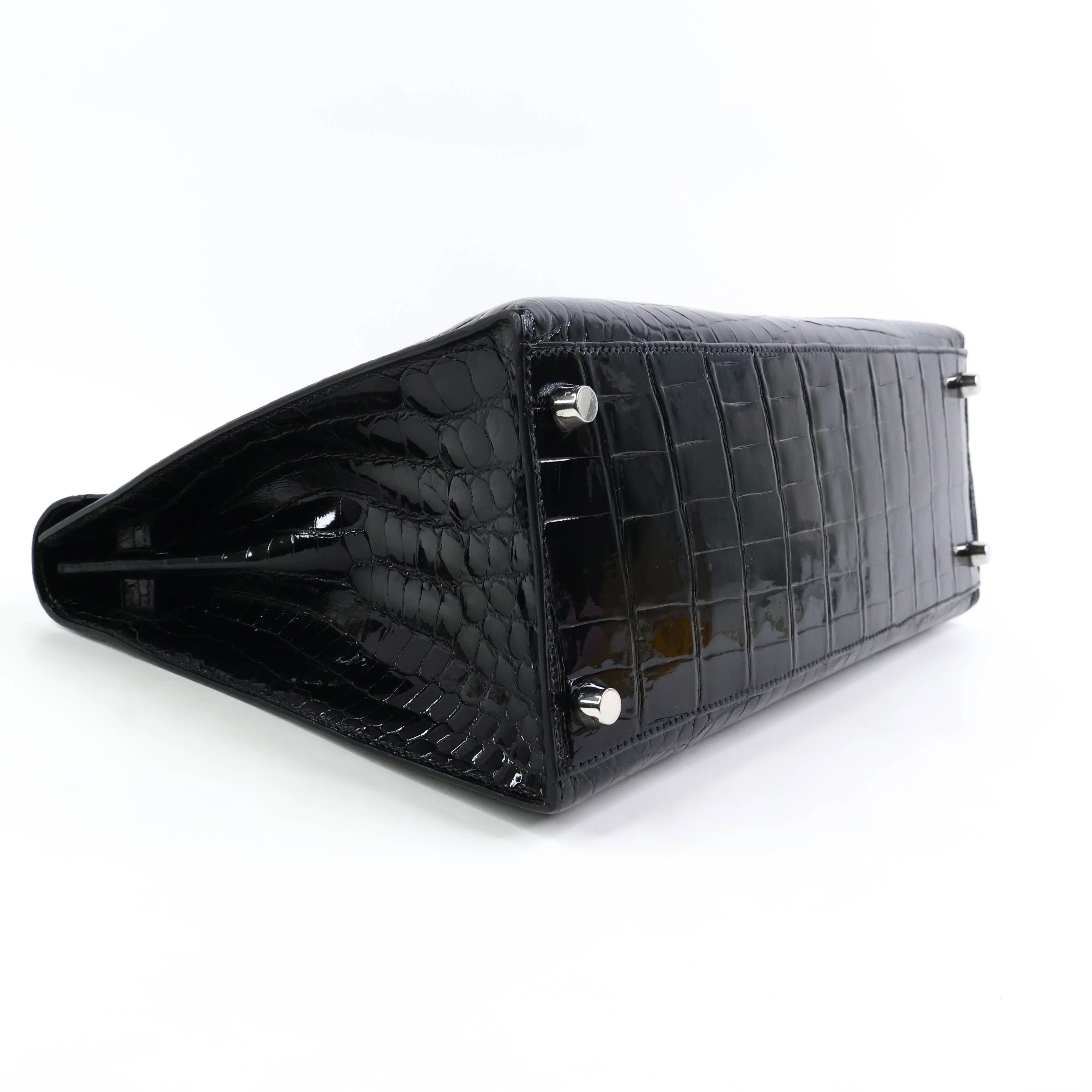 Elevate your style with the Hermes Kelly32 in Black Niloticus shiny crocodile leather. This exquisite handbag combines timeless elegance with luxurious craftsmanship, featuring a sleek silhouette and polished finish that commands attention. Perfect for both sophisticated events and everyday chic, it offers secure closure and a structured design to keep your essentials organized. Indulge in a statement piece that embodies prestige and enduring beauty.