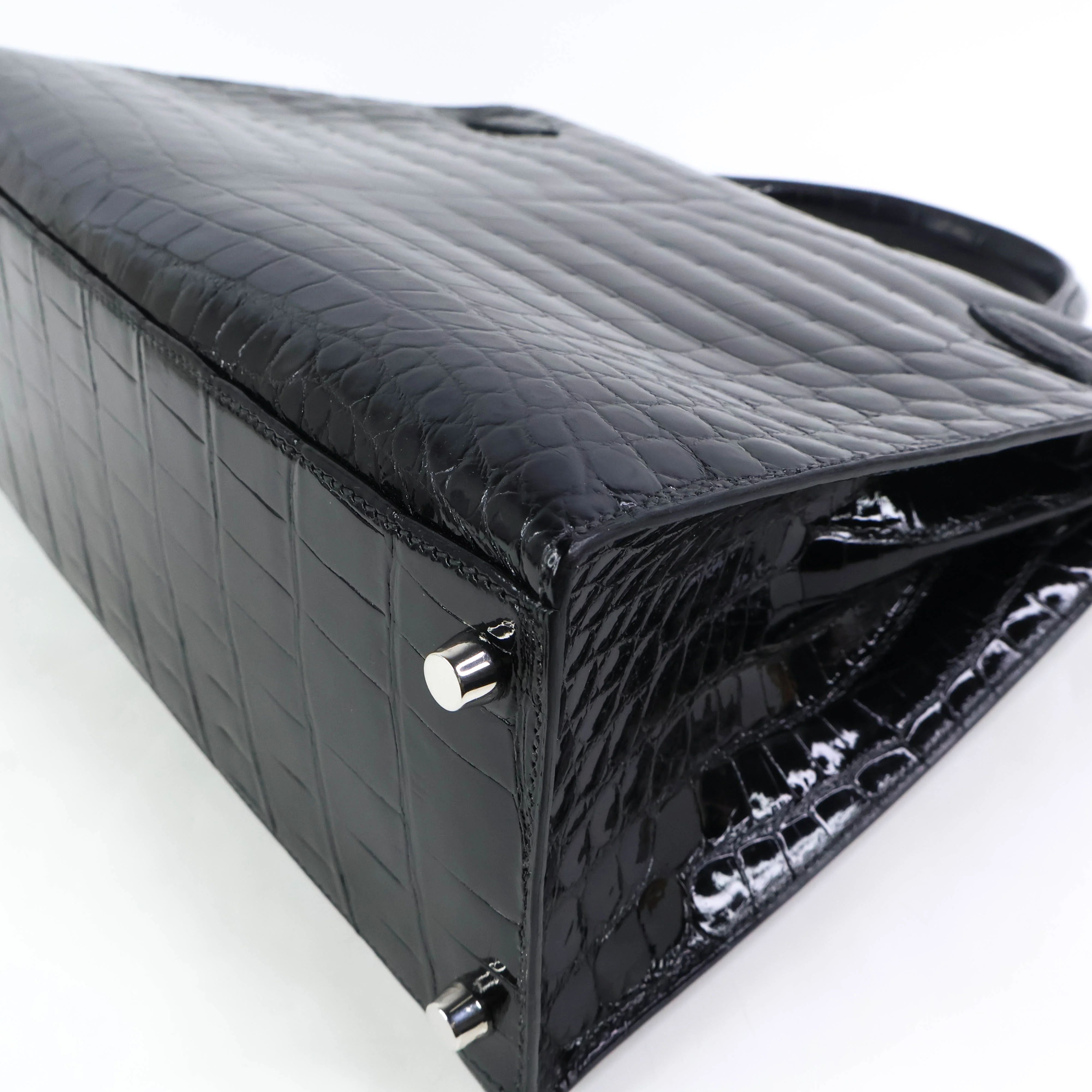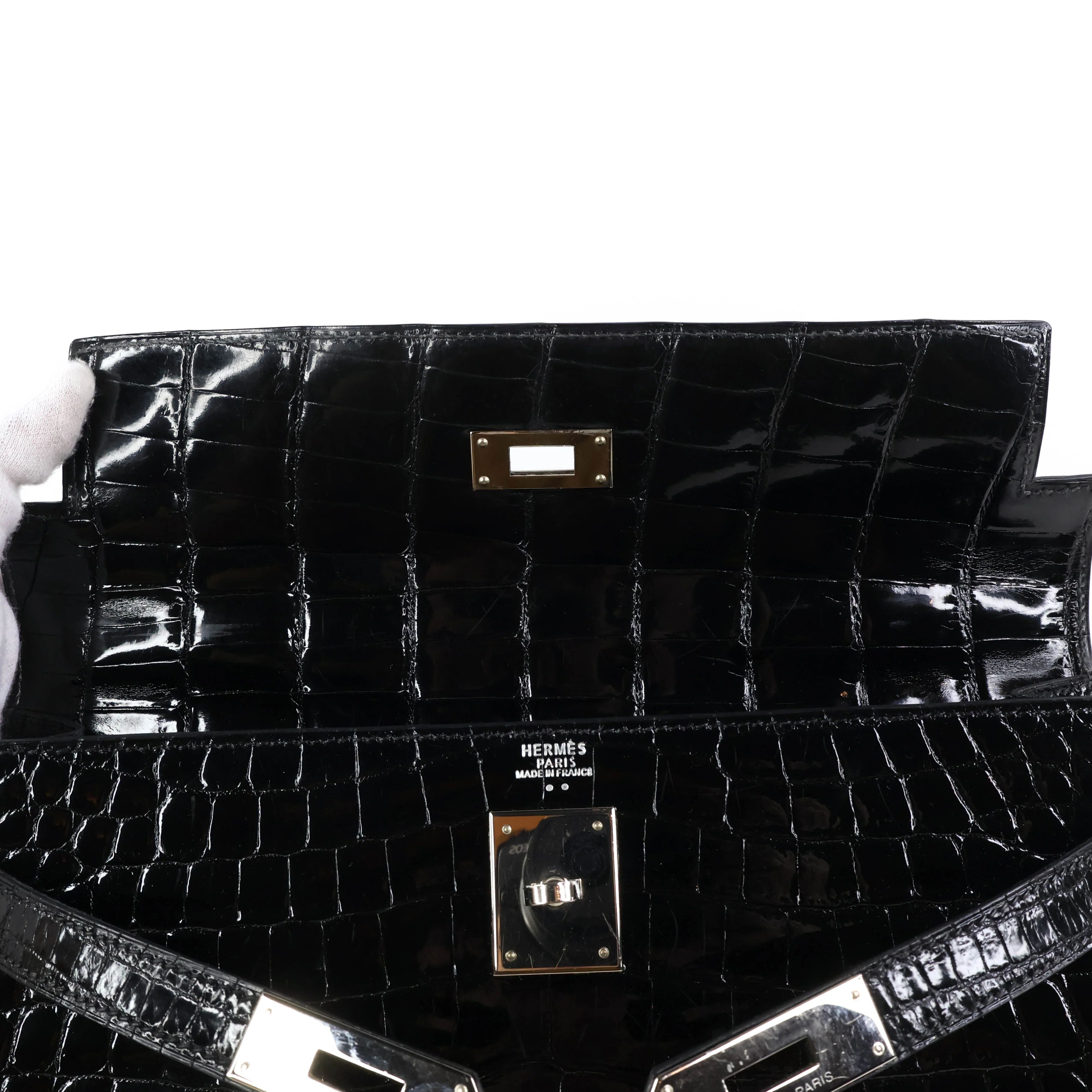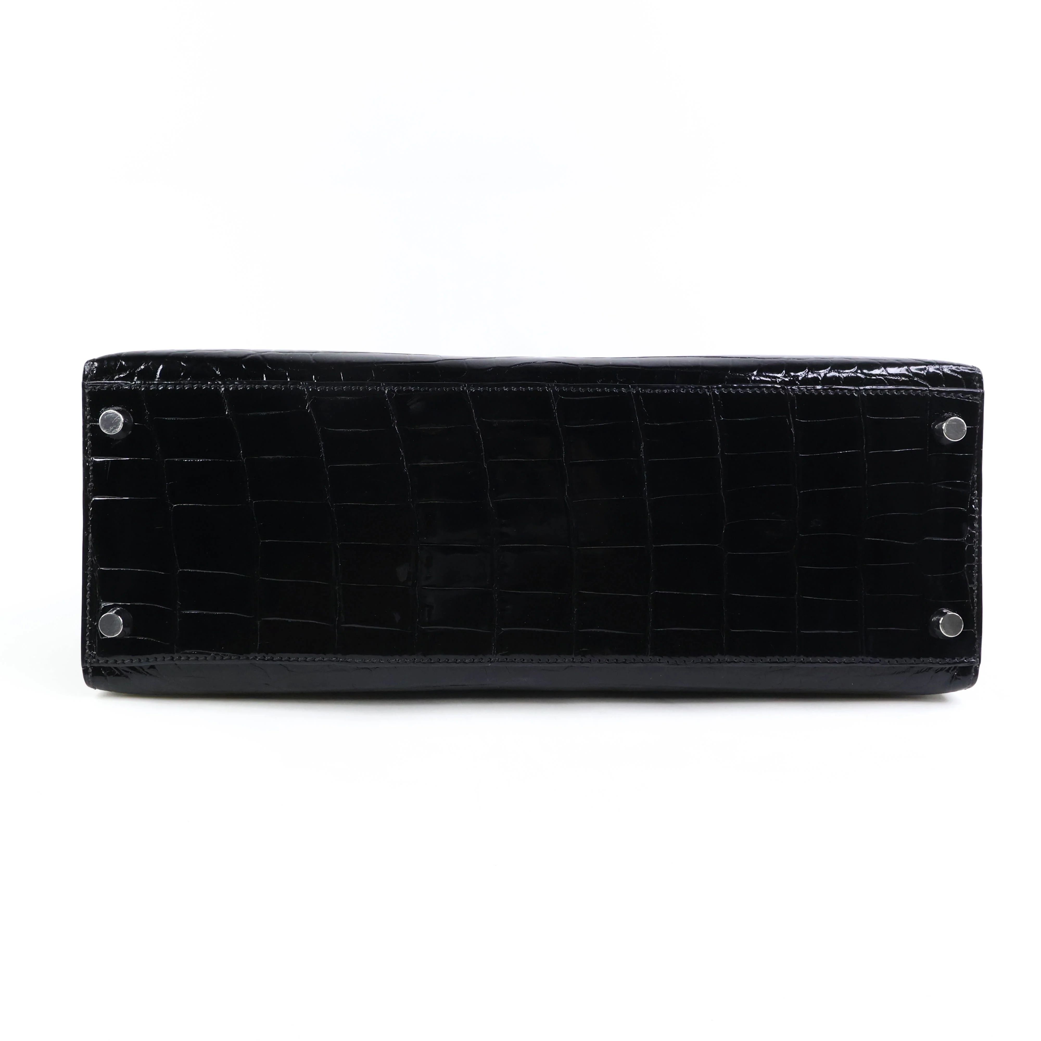 Elevate your style with the Hermes Kelly32 in Black Niloticus shiny crocodile leather. This exquisite handbag combines timeless elegance with luxurious craftsmanship, featuring a sleek silhouette and polished finish that commands attention. Perfect for both sophisticated events and everyday chic, it offers secure closure and a structured design to keep your essentials organized. Indulge in a statement piece that embodies prestige and enduring beauty.
