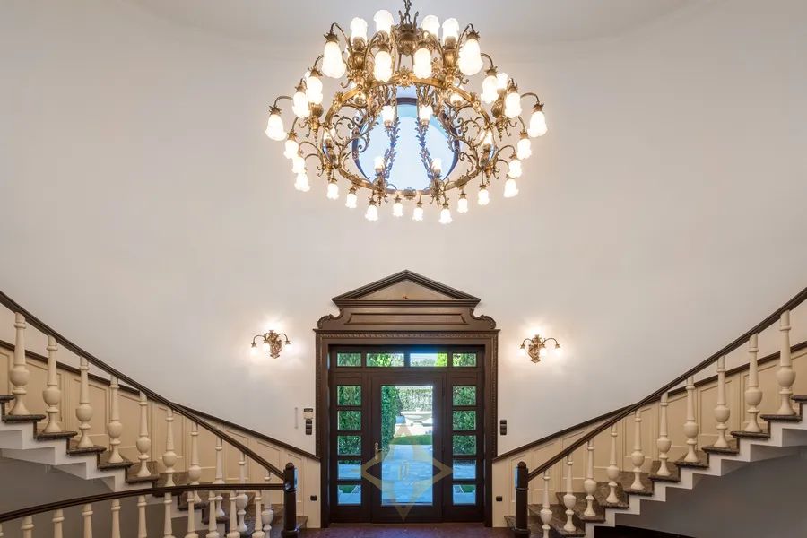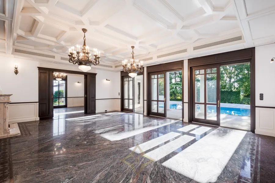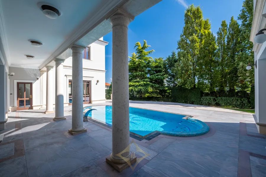 Situated on a 2.063 square meters manicured estate, the villa is framed by landscaped gardens, a decorative fountain, and serene outdoor living areas. The total interior space spans 1.580 square meters, complemented by 406 square meters of terraces and a private pool deck designed for sophisticated entertaining and ultimate relaxation.