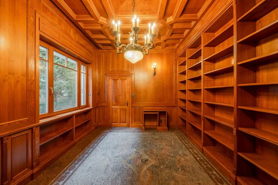 The main floor is a celebration of grand living: a stately salon, formal dining room, bespoke kitchen, cozy bar area, and a richly appointed library with direct access to the outdoor pool and garden.