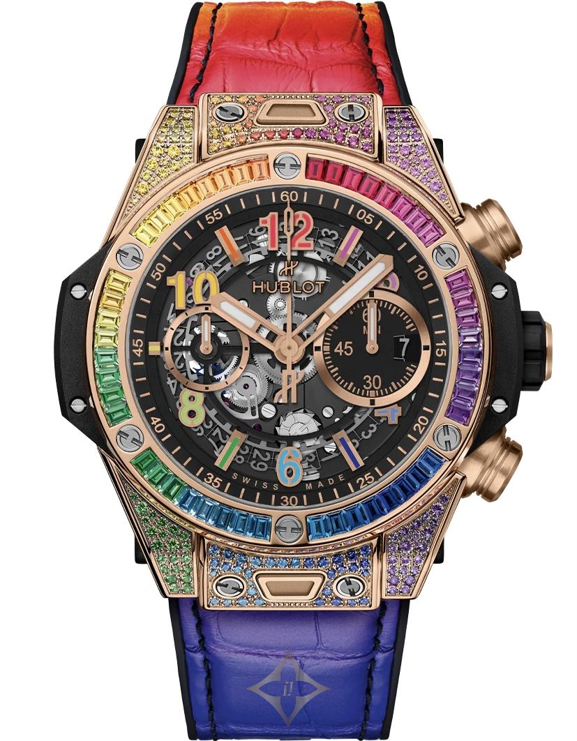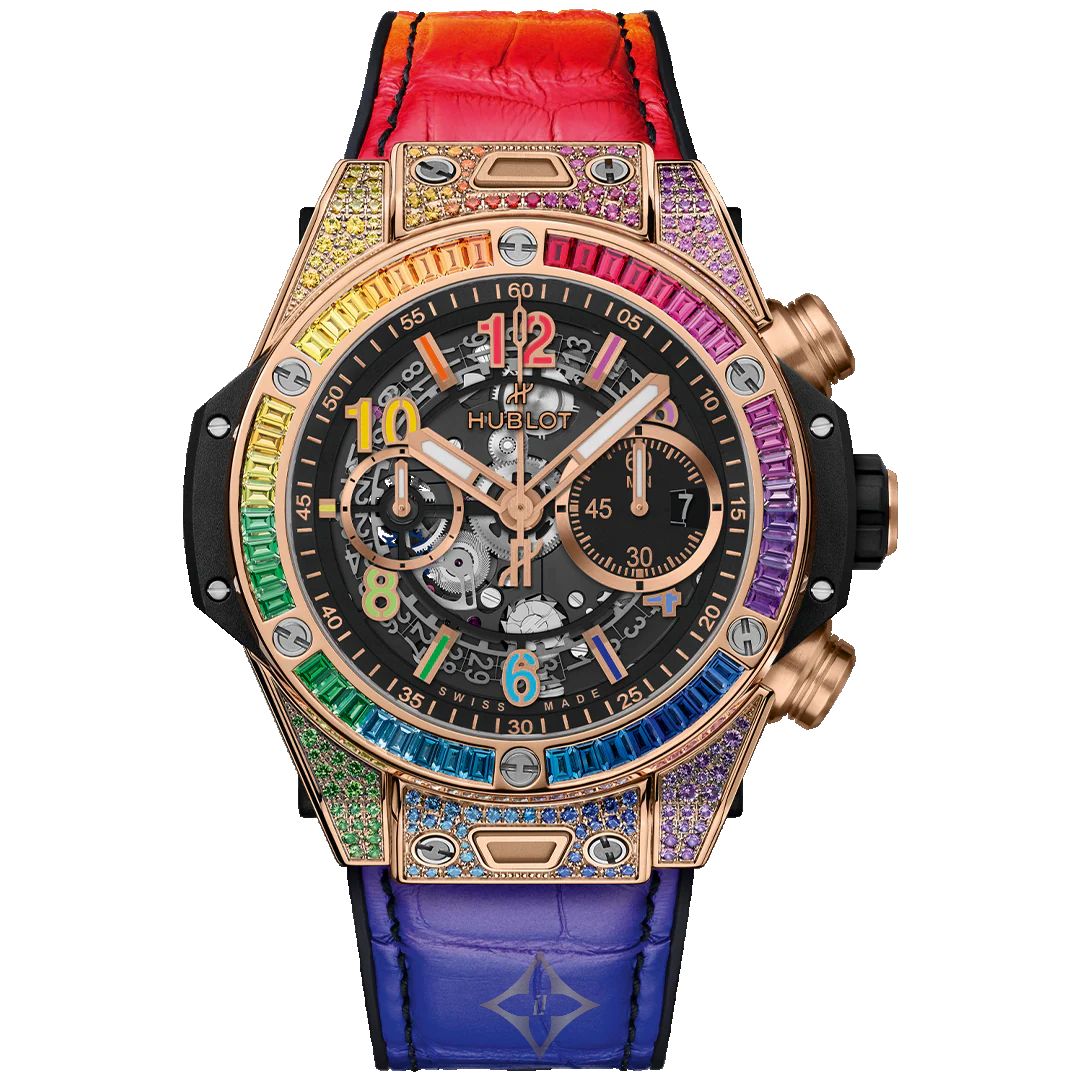 The Hublot Big Bang Unico King Gold Rainbow is a 44 mm watch that combines luxury and color with a King Gold case adorned with multicolored gemstones. The skeleton dial and decorated bezel add a touch of modernity and sparkle. The interchangeable strap completes a unique and vibrant design, perfect for those who love to stand out in style.