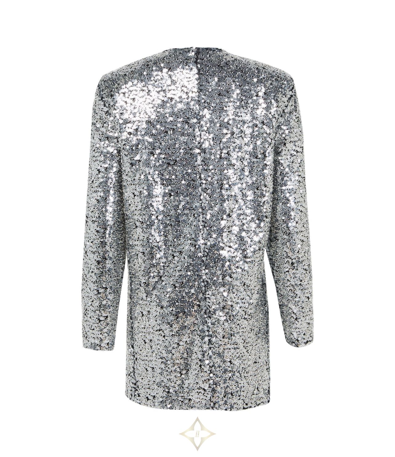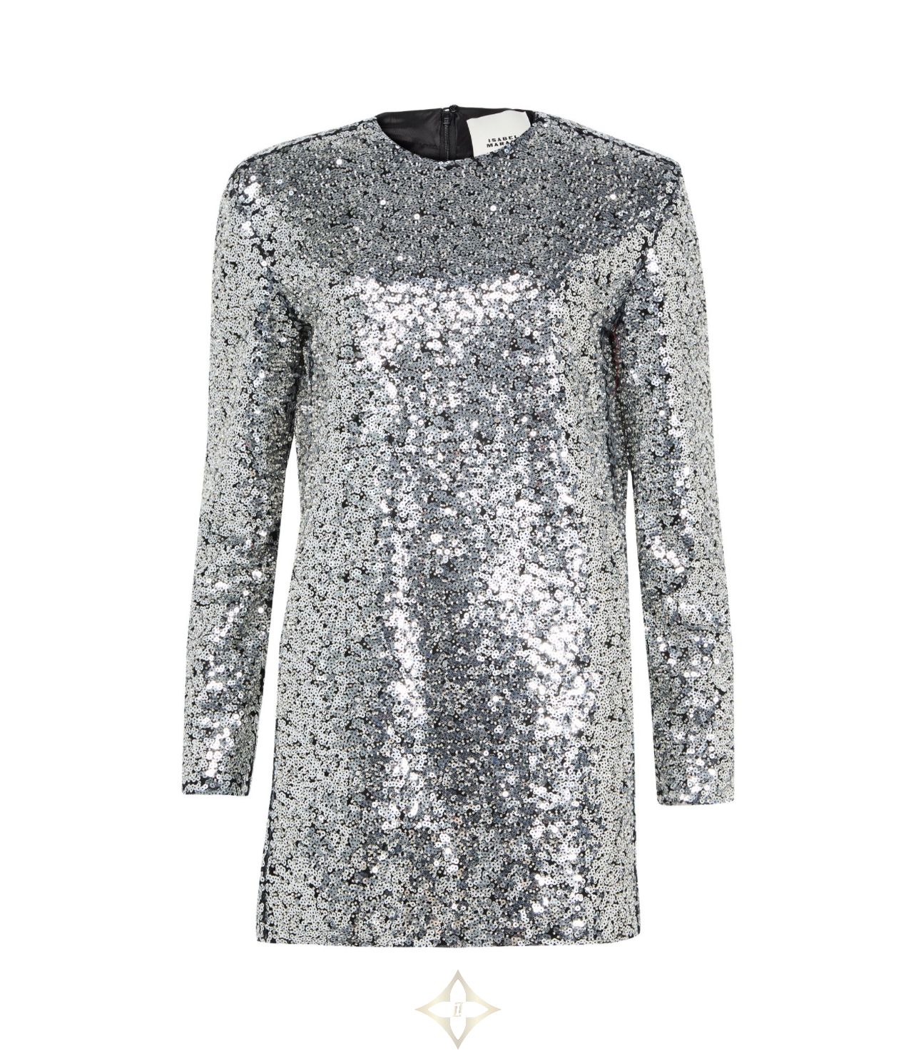 Sequin-embroidered / all-over sequin embroidery, mini dress, round neck, long-sleeved, back zipper closure, silver finish, sequin details.