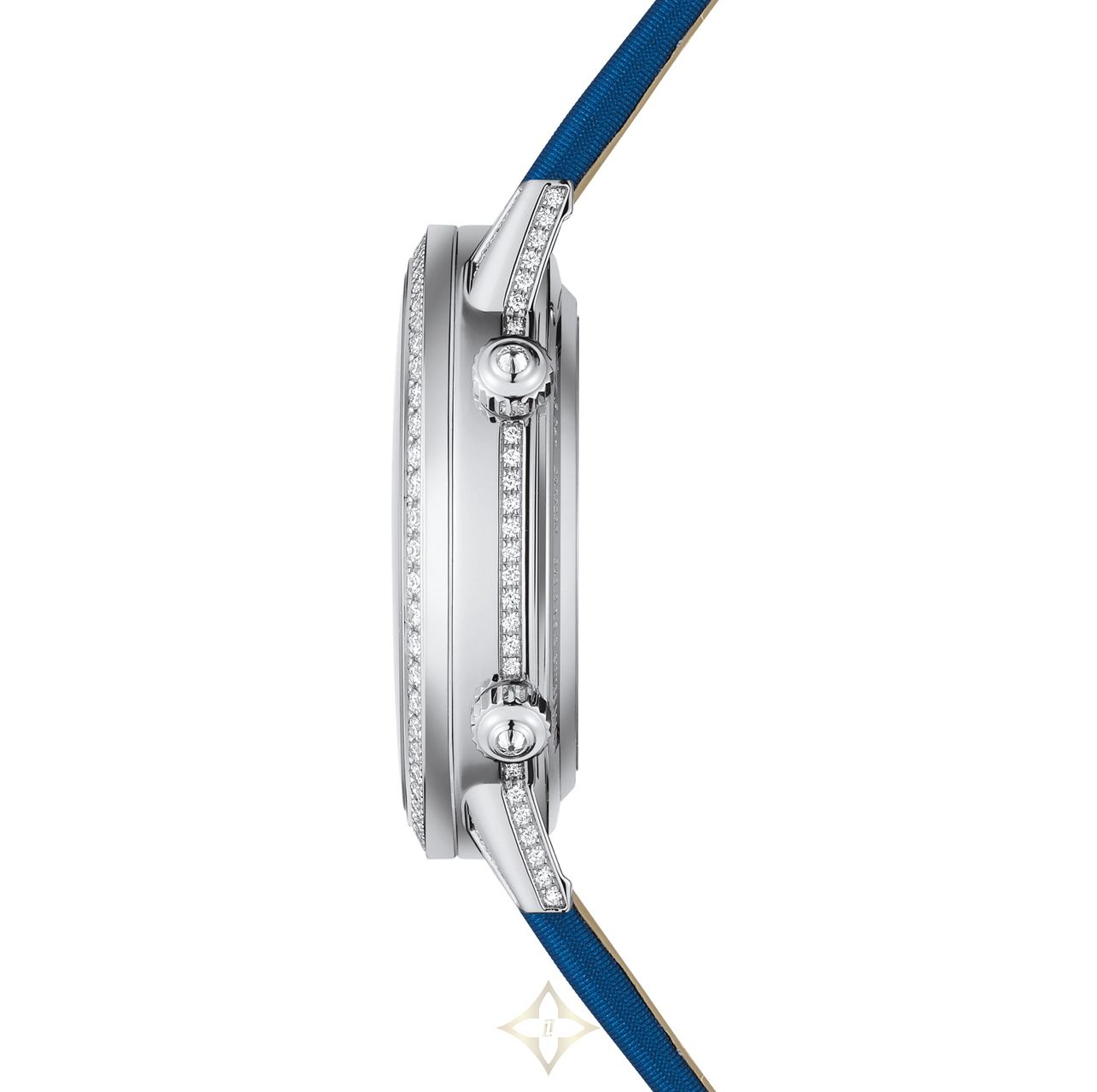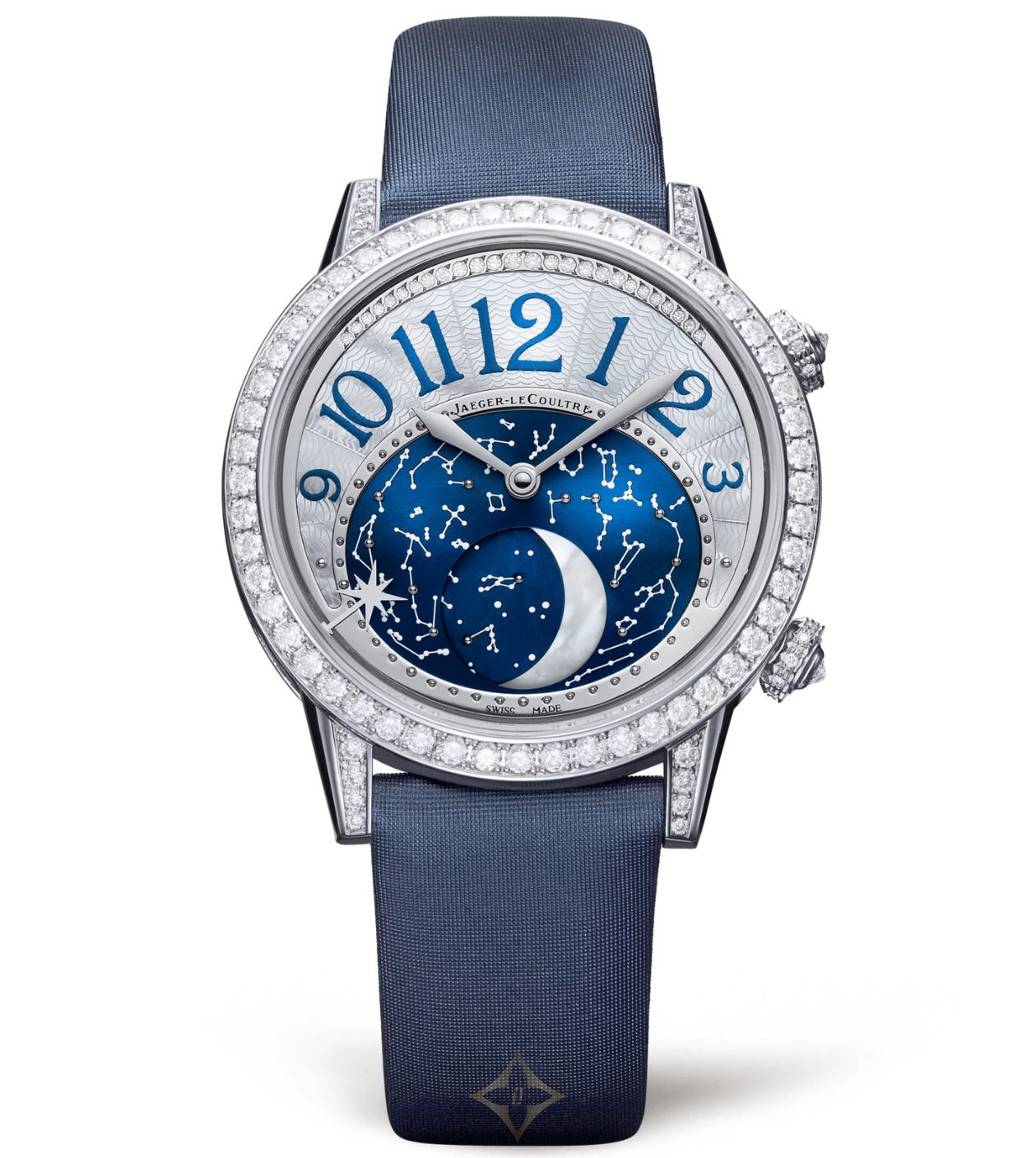 Jaeger-LeCoultre Rendez-Vous Jewellery Moon. 36 mm case in 18K white gold with a diamond-set bezel. Automatic movement. Blue satin strap. Celestial dial with Arabic numerals and large moonphase display. Powered by the 935 calibre. Functions: hours, minutes and moonphase.