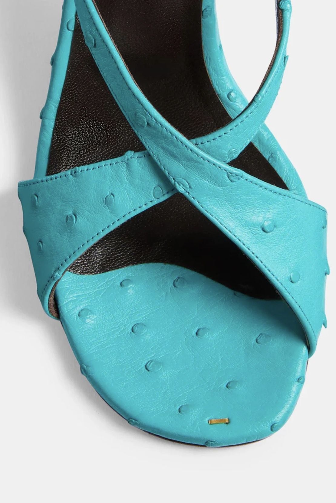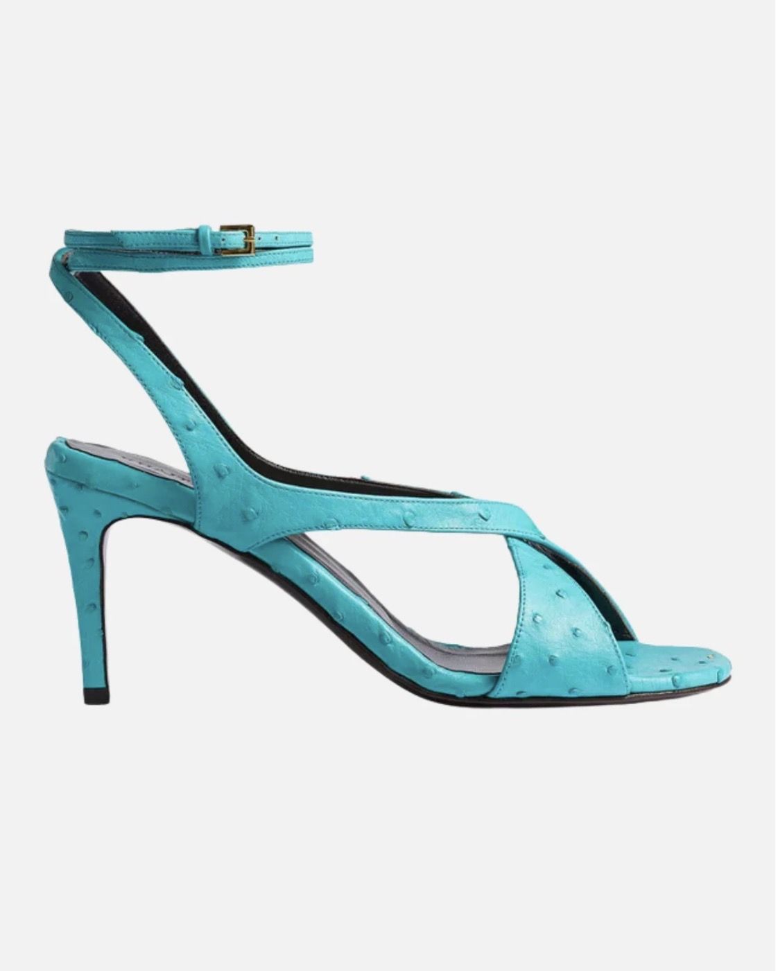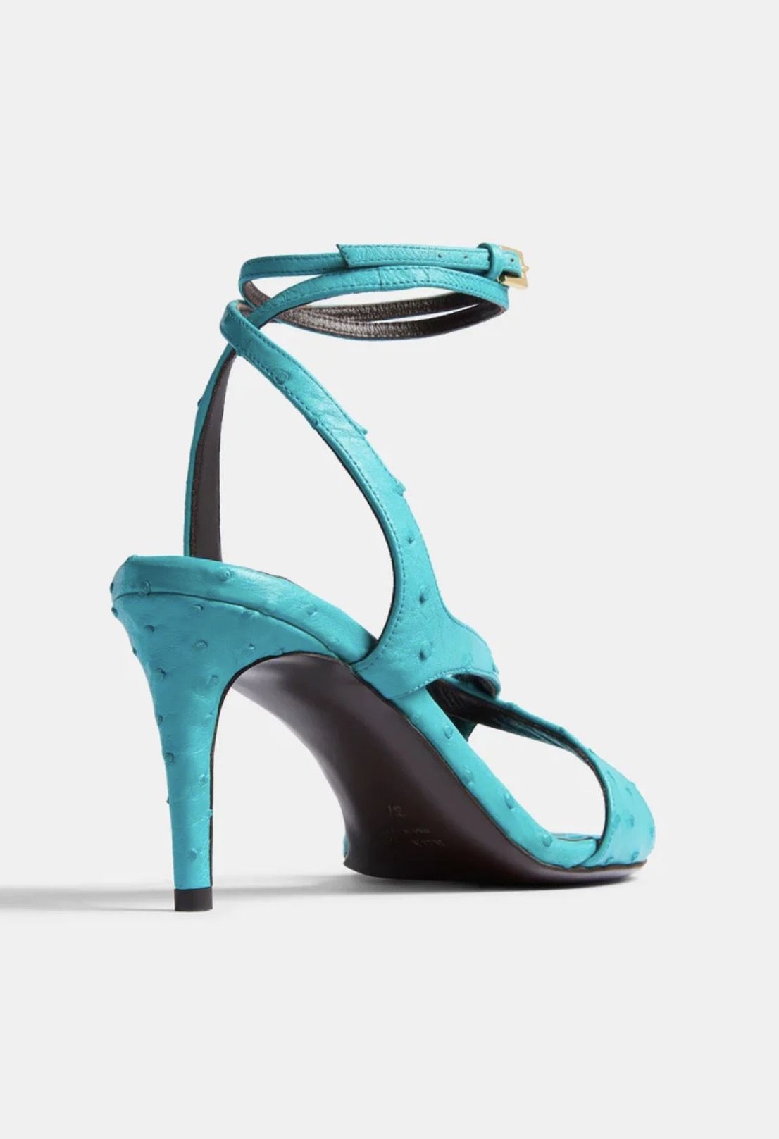 Crafted from 100% ostrich leather in an incredible turquoise blue, KHAITE's exquisite Liria sandal is a sculptural work of wearable art. Designed with delicate, ribbon-like bands that gracefully wrap the foot and fasten at the ankle with a gold buckle, this heel is finished with a signature gold staple detail at the front of the footbed. Elegant yet edgy and perfectly constructed in Italy, this shoe is the ultimate finishing touch.