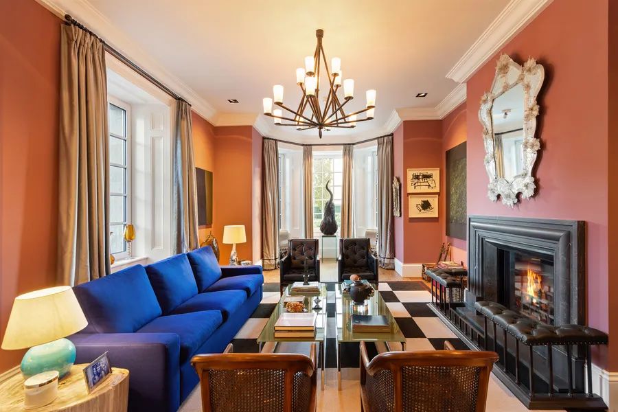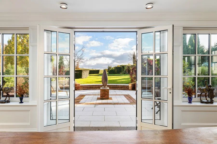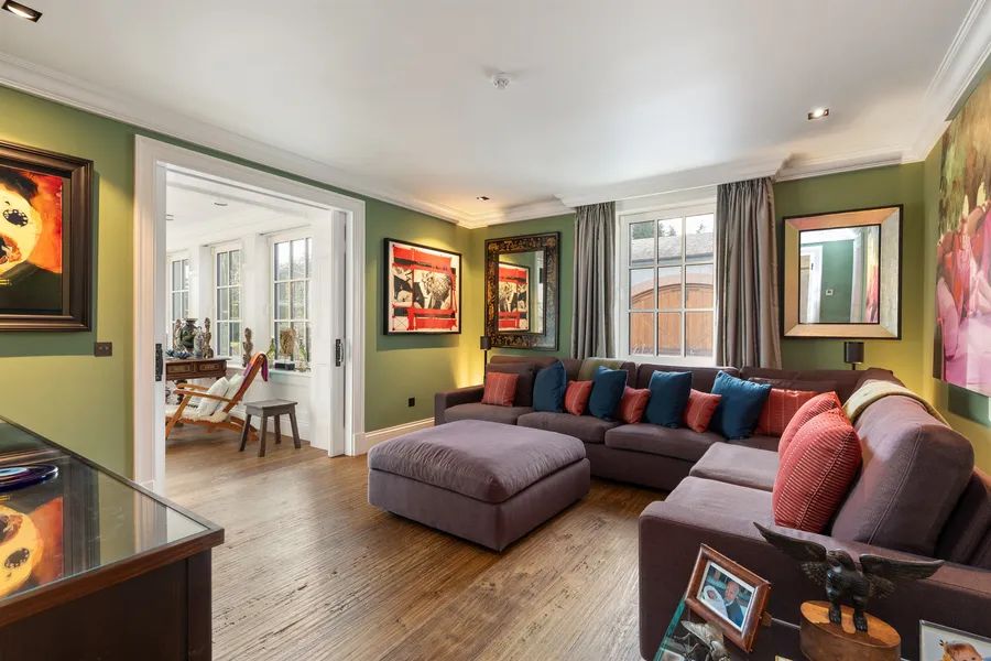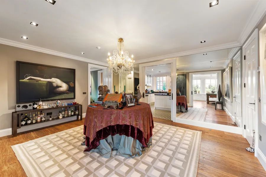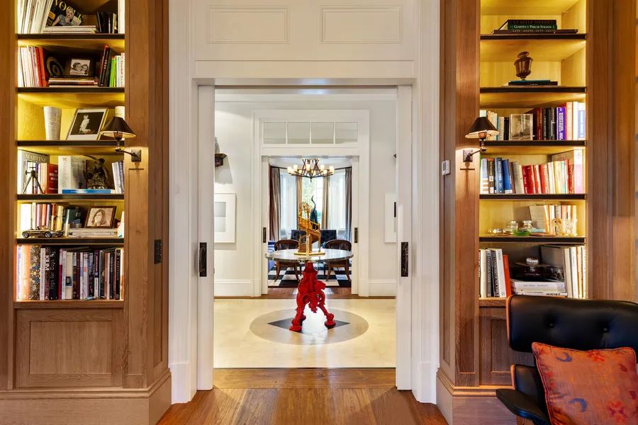 The house is entered through a stone portico and front door which opens to an impressive entrance hall with marble flooring. A feeling of harmonious proportion and balance is achieved in the entrance hall by four symmetrical doors and mirrored panels. The hall opens to the left into a formal drawing room featuring a fine bay window and to a library on the right featuring floor to ceiling fitted oak bookcases, with fireplaces in both rooms. The library, hall and drawing room open onto each other via sliding doors with wide openings thereby creating the feeling of continuous space in an enfilade design and a serene and elegant atmosphere.