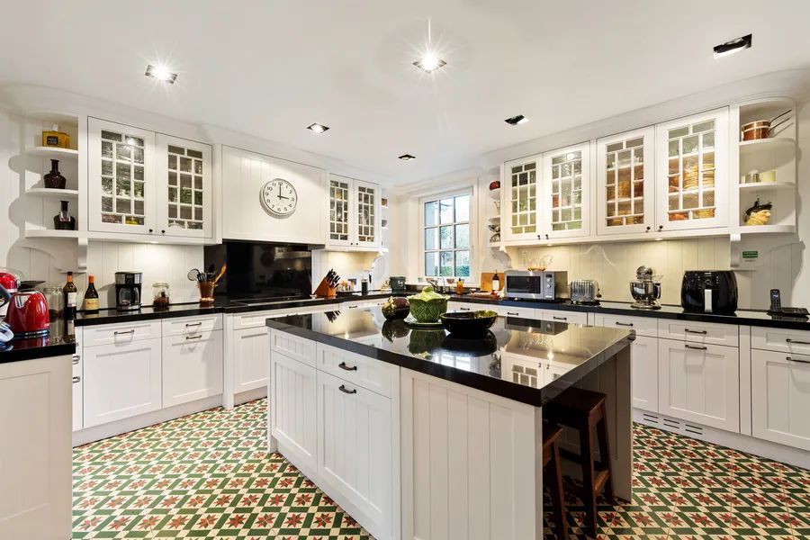 The entrance hall also leads into a dining room, a powder room and the kitchen via an inner hall. The spacious custom integrated kitchen is fitted with a full suite of top-quality appliances and leads to a boot/mud room with separate side entrance.