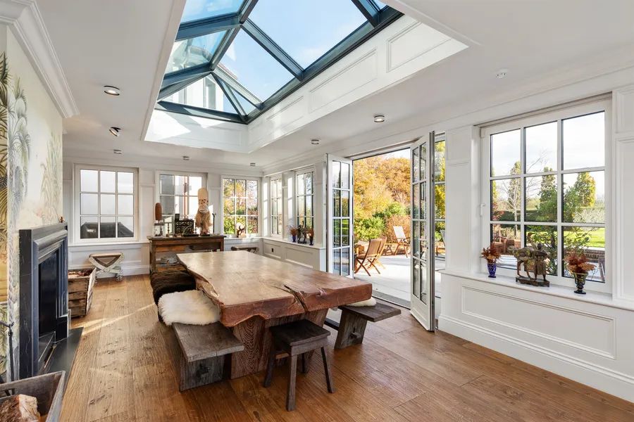 The focal point of the house is the large conservatory built in stone with extensive exterior architectural mouldings. The conservatory is a luminous space featuring ten windows, double doors to a terraced area and the garden, a large skylight, a fireplace and hand painted wallpaper. This stunning room opens directly south onto a terrace perfect for al-fresco dining and entertaining. The conservatory can be accessed from the dining room and from the sitting room.