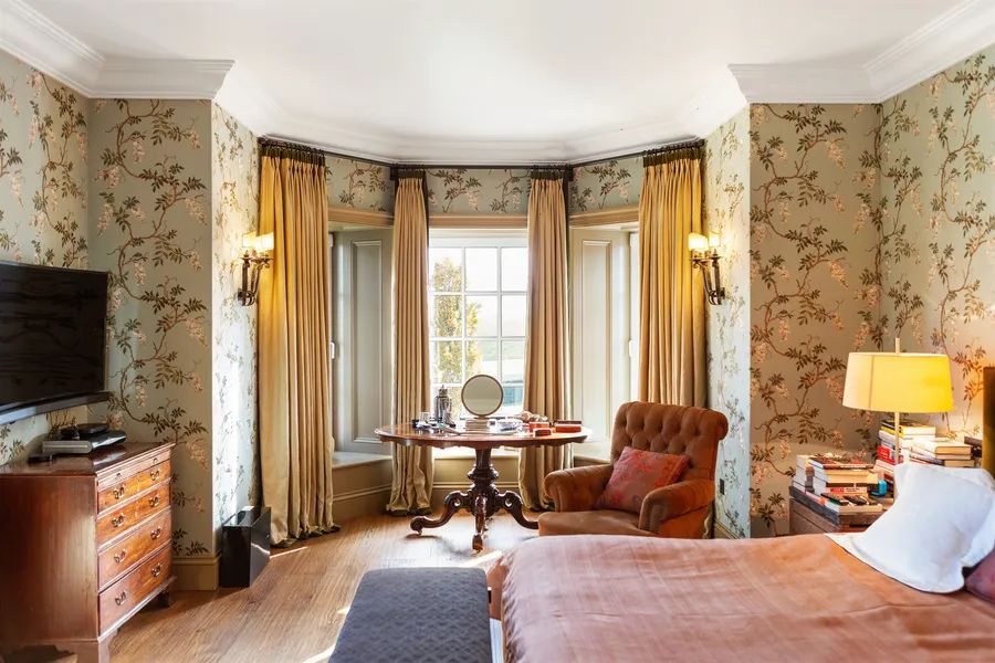 The staircase to the first-floor features oak treads and a beautiful, one of a kind bespoke cast iron handrail created by an Italian artist. The first-floor gallery landing’s sense of arrival ushers one towards the principal bedroom suite occupying the entire footprint of the front of the house. The suite enjoys wonderful sea views complementing the southerly and northerly outlooks over the grounds. Here one finds the main bedroom, an oak panelled dressing room, a private office area overlooking the sea, and a stunning double aspect his and hers ensuite bathroom with floor to ceiling stone-framed mirrored walls which enhance the feeling of light and space.