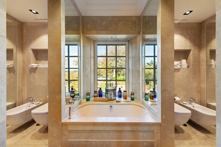 A sitting room lies adjacent to the conservatory. The sitting room leads to a guest bedroom suite which completes the ground floor accommodation. The walls in the guest suite are upholstered in fabric. The room includes fitted cedar-lined wardrobes. The adjoining bathroom is finished in stone from floor to ceiling, features impressive fittings, built-in cabinets, and a magnifying makeup mirror. All ensuite bathrooms are finished in stone from floor to ceiling, feature direct light surrounding the mirror as well as bright ceiling light. With one exception all bathrooms have windows to the outside.