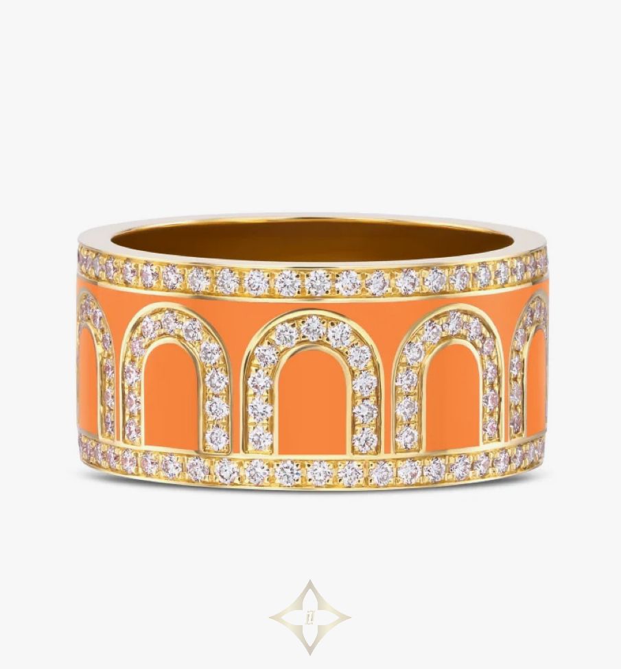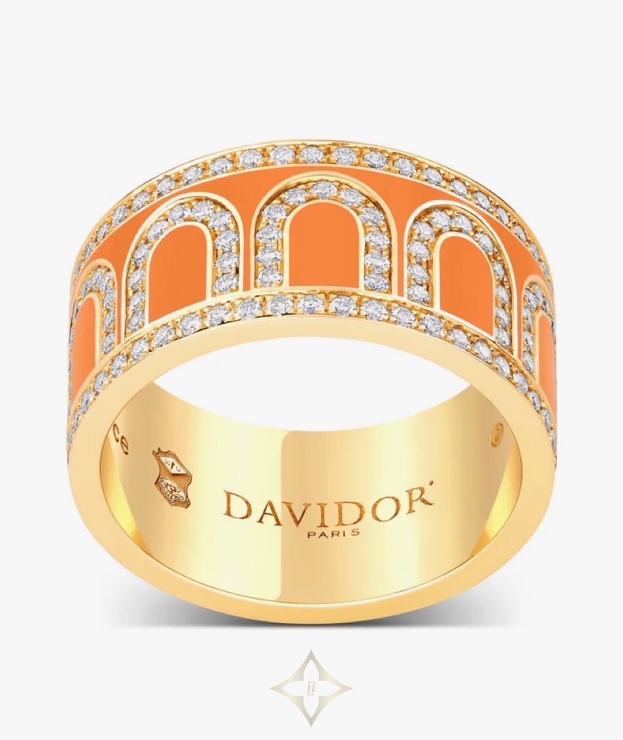L'Arc de DAVIDOR Ring GM, 18k Yellow Gold with Zeste Lacquered Ceramic and Palais Diamonds PRICE: €12.300,00 EUR Material: 18k Yellow Gold / Lacquered Ceramic Color: Zeste DESCRIPTION The signature L'Arc de DAVIDOR Ring GM in 18k Yellow Gold with Lacquered Ceramic and Palais Diamonds. This handcrafted stackable ring features the iconic repetitive DAVIDOR Arch pattern with diamonds on every arch and both borders. The GM Ring is DAVIDOR's widest ring in the L'Arc de DAVIDOR collection. Crafted by hand in DAVIDOR's Paris Atelier. SKU: ADR030247-0109 DETAILS 18k Yellow Gold Lacquered Ceramic Palais Diamonds: 1.05 Total Carat Weight, F+ VVS+ Width: 9mm Crafted by hand in DAVIDOR's Paris Atelier Unique Serial Number Made in France Hallmark "Joaillerie de France" ——— DAVIDOR Head Office - France DAVIDOR France SAS 12, rue de la Paix, 75002 Paris, France Telephone: +33 (0) 1 42 86 88 22 WhatsApp: +33 1 42 86 88 22 Email: contact@davidor.com  * Boutique Riyadh, Centria Mall Olaya St, Riyadh 1167 Saudi Arabia