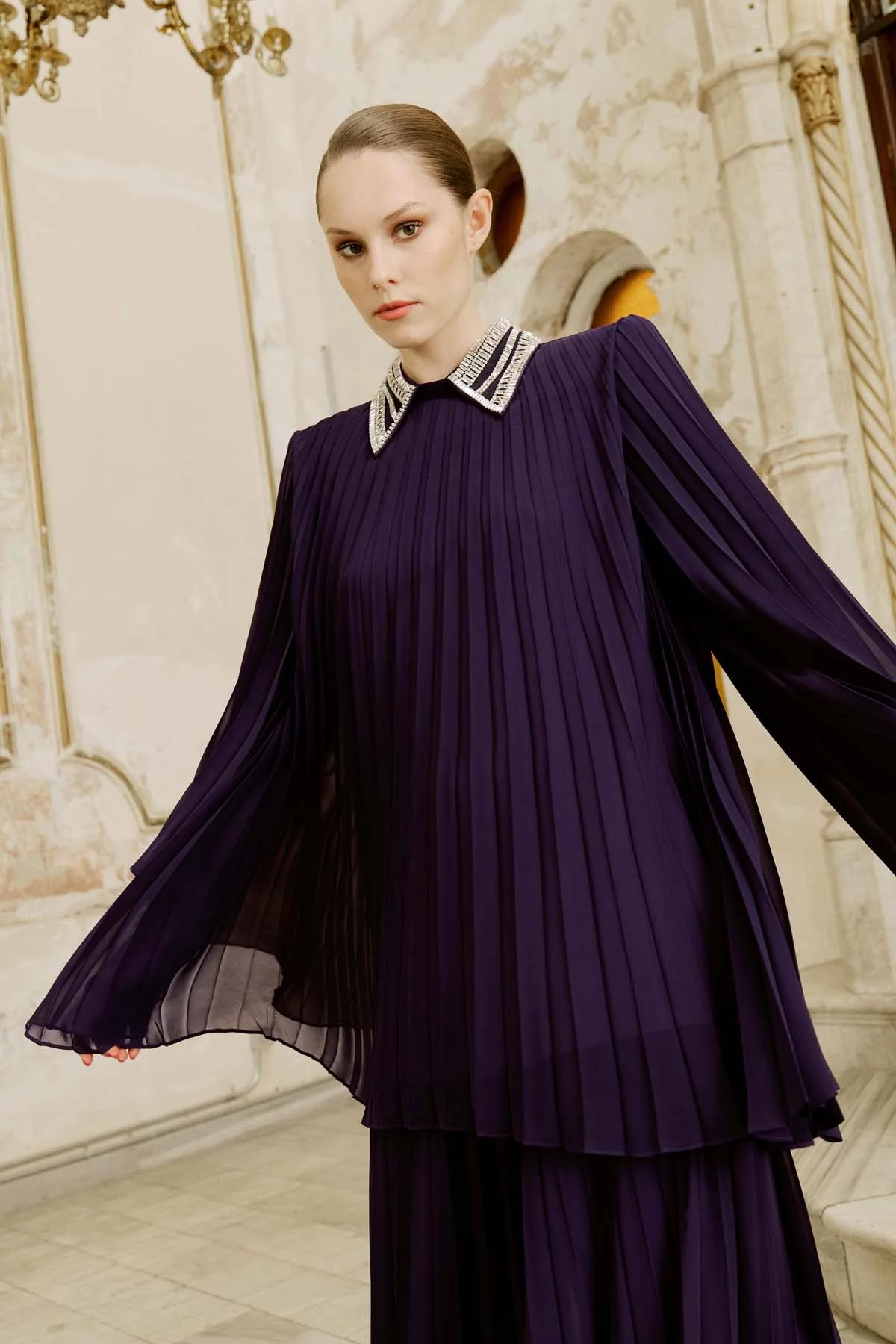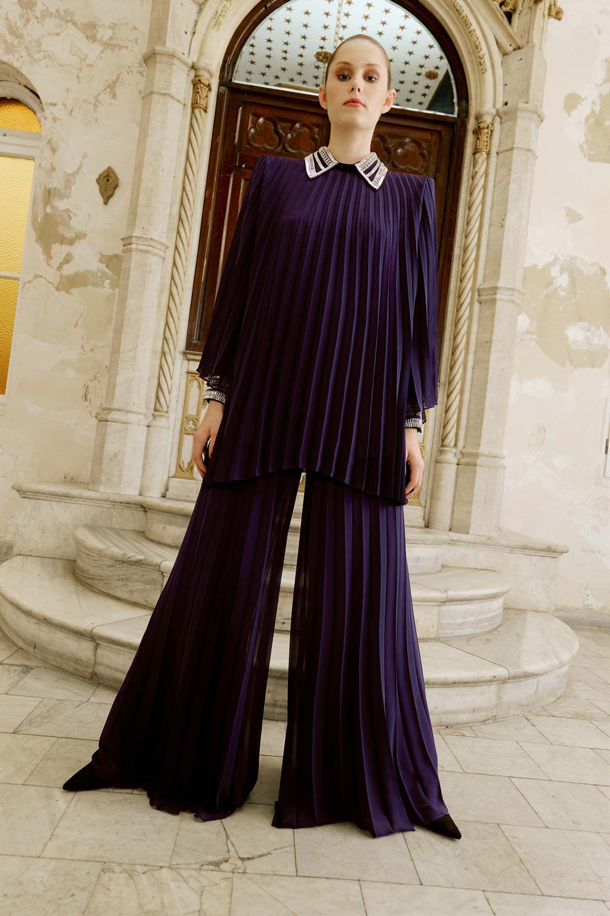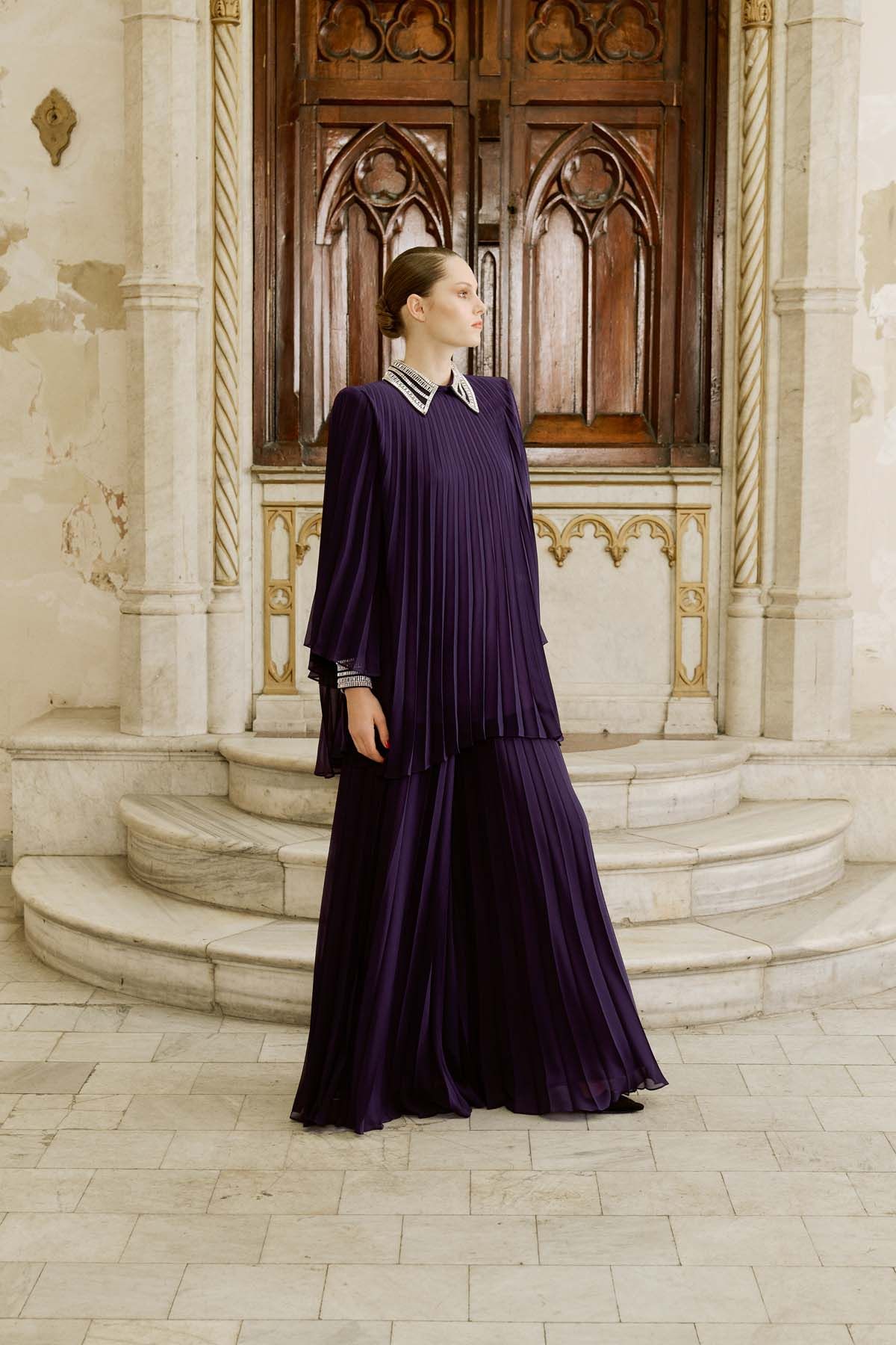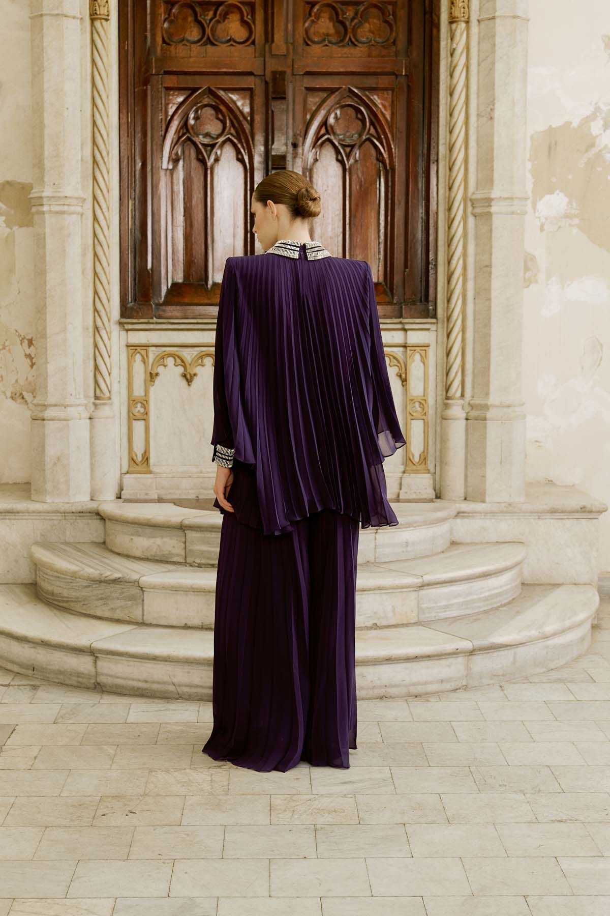 Crafted from pleated chiffon fabric, this purple set features wide-leg trousers and a tunic-style top for an elegant silhouette. The embellished collar and cuffs add a touch of sparkle, while the flowing design ensures ease of movement. A concealed back zipper allows for effortless wear. Perfect for occasions ranging from special events to elegant dinners. The model is 177 cm tall and wears a size 36 (EU).