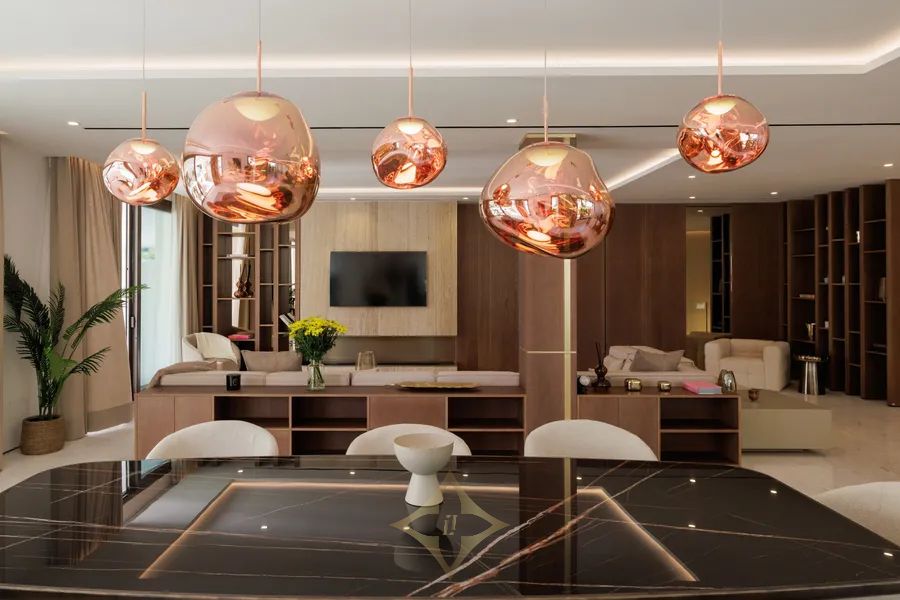 Every detail has been meticulously planned, including floor-to-ceiling glass windows that frame panoramic, south-west facing vistas over the manicured gardens and tranquil lagoon-style pool. The home’s interior space of 443m² is complemented by 105m² of private terrace, providing seamless outdoor-indoor living, an alfresco dining area, a barbecue, and a dedicated outdoor kitchen for entertaining. The master suite incorporates a walk-in wardrobe by Fendi Casa, while living areas such as the cinema room, games room, and mini bar provide comfort and entertainment for all ages.
