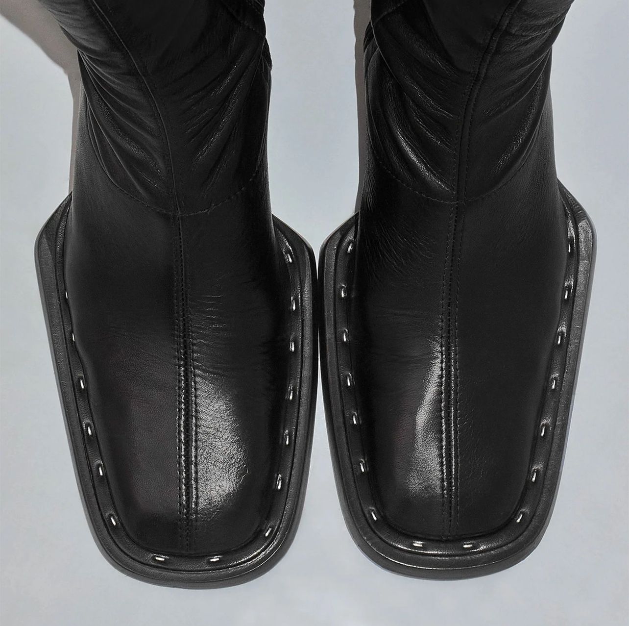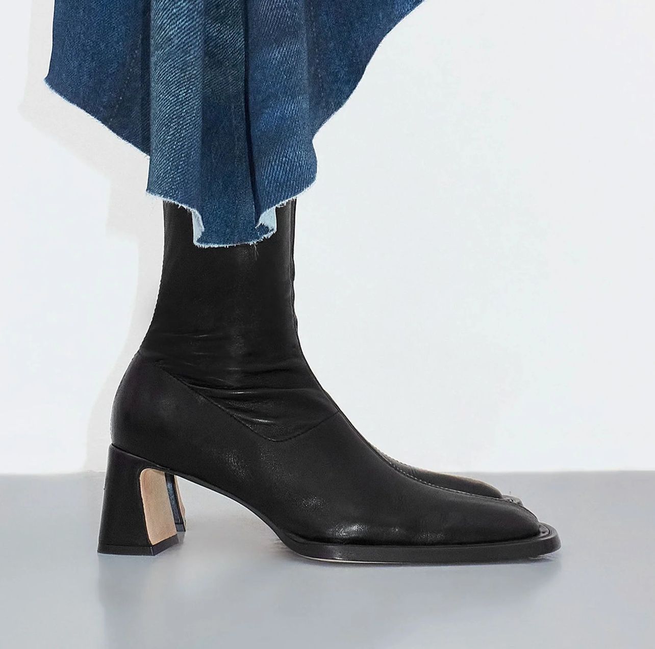 Chasity by Miista is a black mid-calf boot with a softly squared toe and angled block heel. Made from smooth stretch leather, it features subtle seam detailing and tonal topstitching at the upper edge. The close-fitting shaft creates a sleek shape that works well with straight-leg trousers or layered under a midi dress.