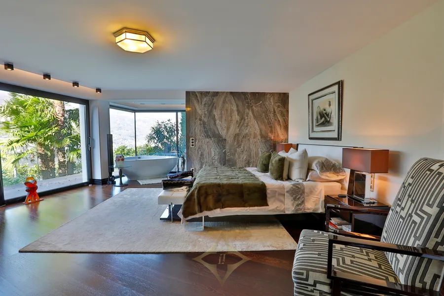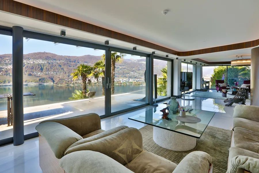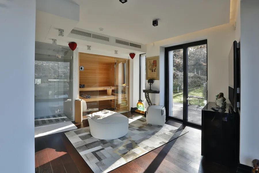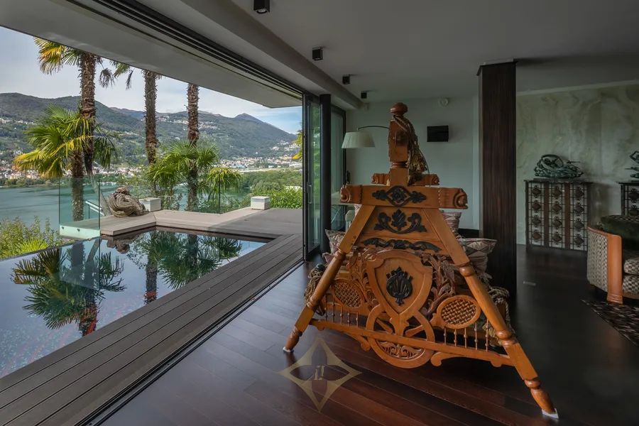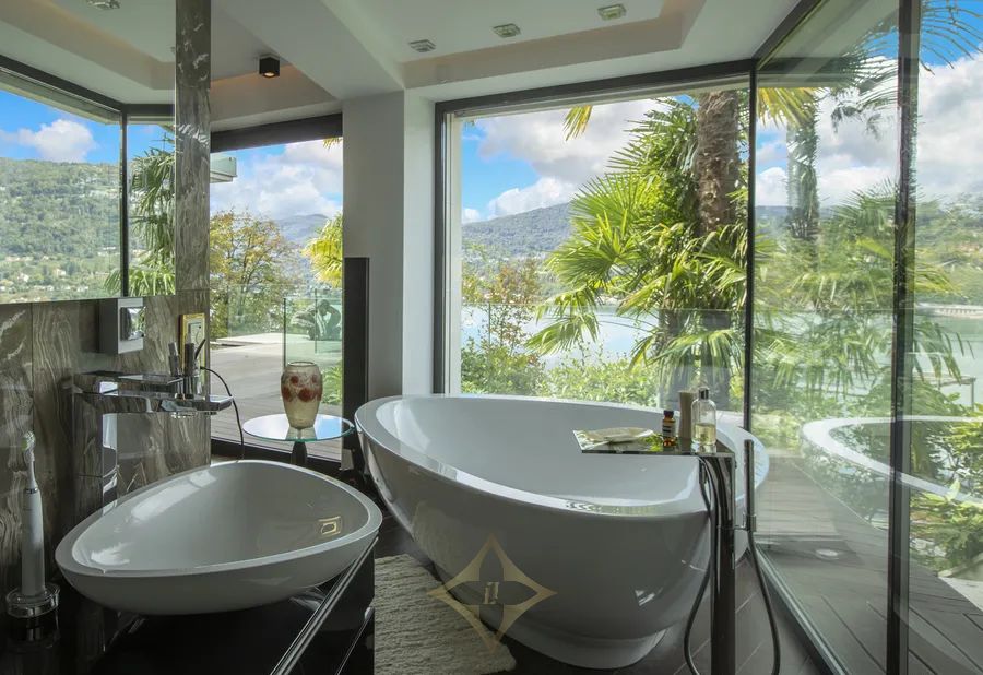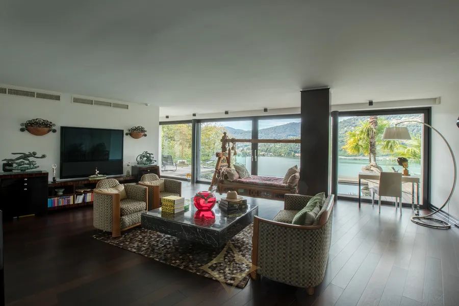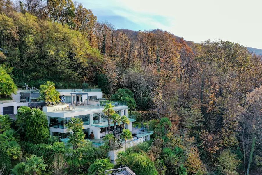 This superb property is west oriented, set on a large plot of 4’637 sqm (of which 3’511 sqm of woodland and 50 sqm of a parcel on the lake with a private dock), offers a living area of about 440 m2 across three levels, plus another 400 sqm of terraces (with wellness area with sauna, heated infinity pool, kitchen, BBQ and pergola), features an independent guest apartment, private Boat House and guarantees maximum privacy and tranquillity.