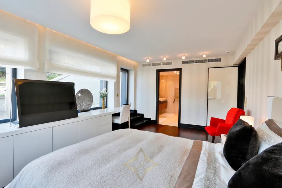 Master bedroom with separate dressing room and en-suite bathroom, living room, WC, fitness area with sauna and shower, laundry, terrace with infinity pool, garden;