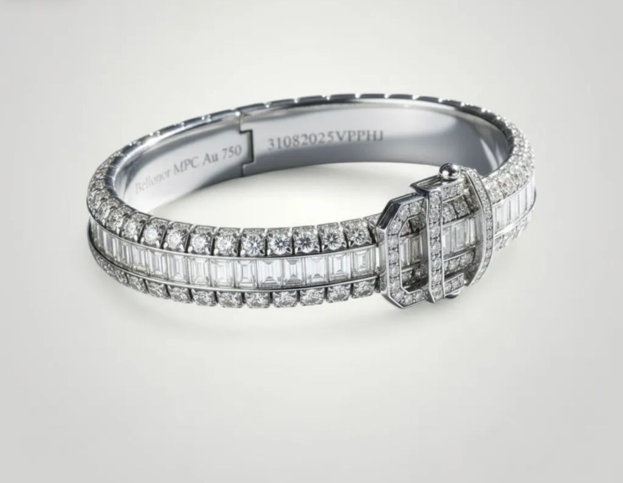 The first line of round diamonds gently captures light, providing a delicate shimmer. The heart of the bracelet reveals baguette diamonds of exceptional rarity, cut with millimeter precision to create perfect continuity and a unique shine.
