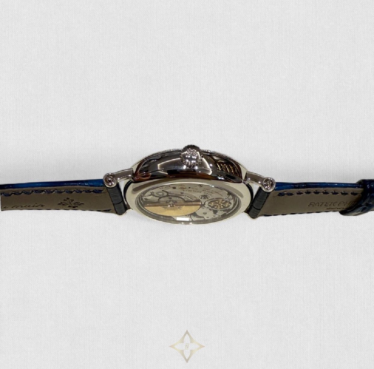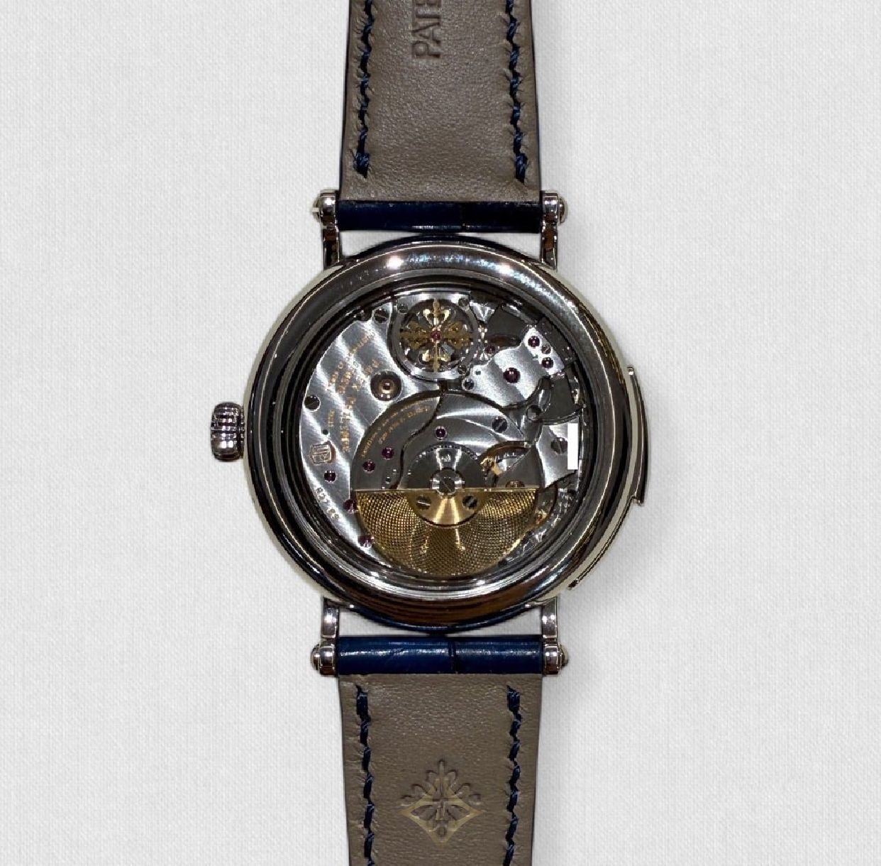 Beneath that exquisite facade lies the beating heart of this timepiece, the manually wound Patek Philippe Caliber 215 PS. It’s more than just gears and springs; it’s a testament to human ingenuity and dedication to perfection. Turn the watch over, and the sapphire crystal case back invites you to marvel at the intricate workings of this mechanical wonder.
