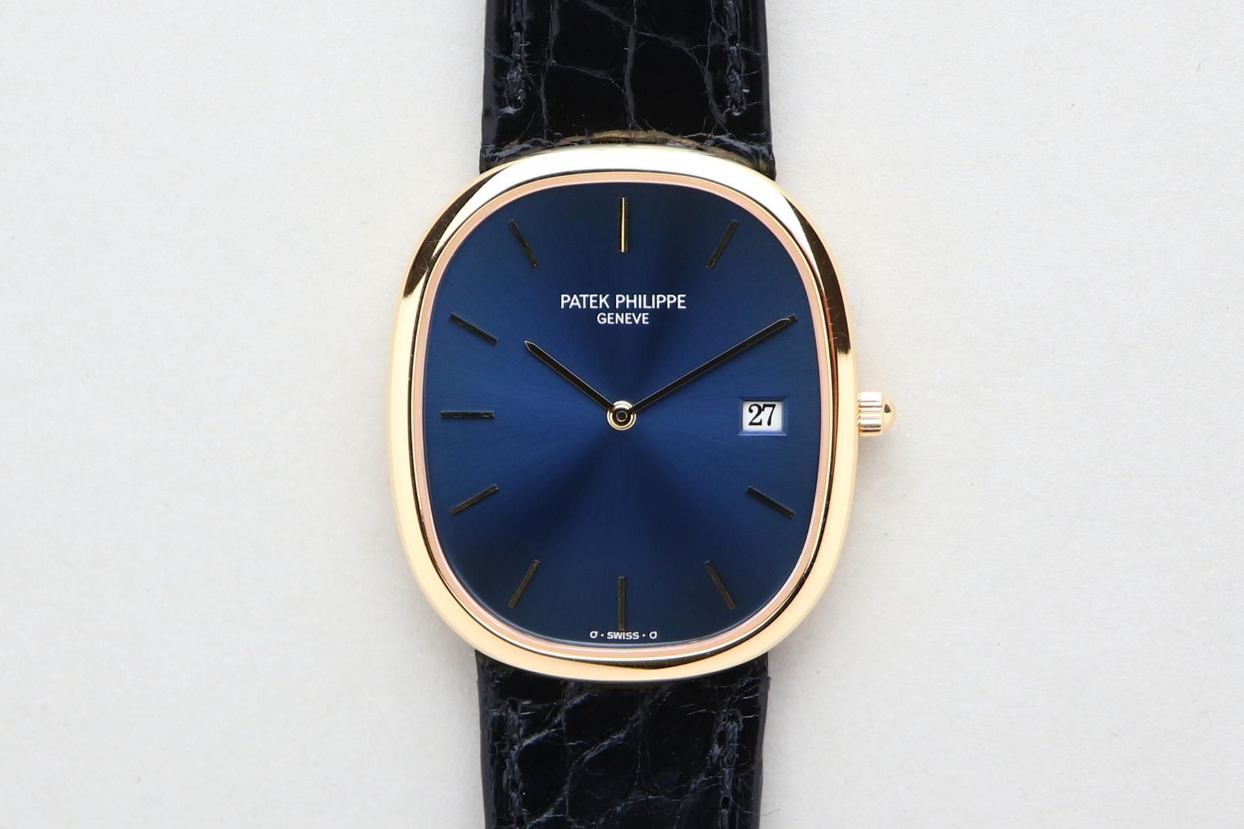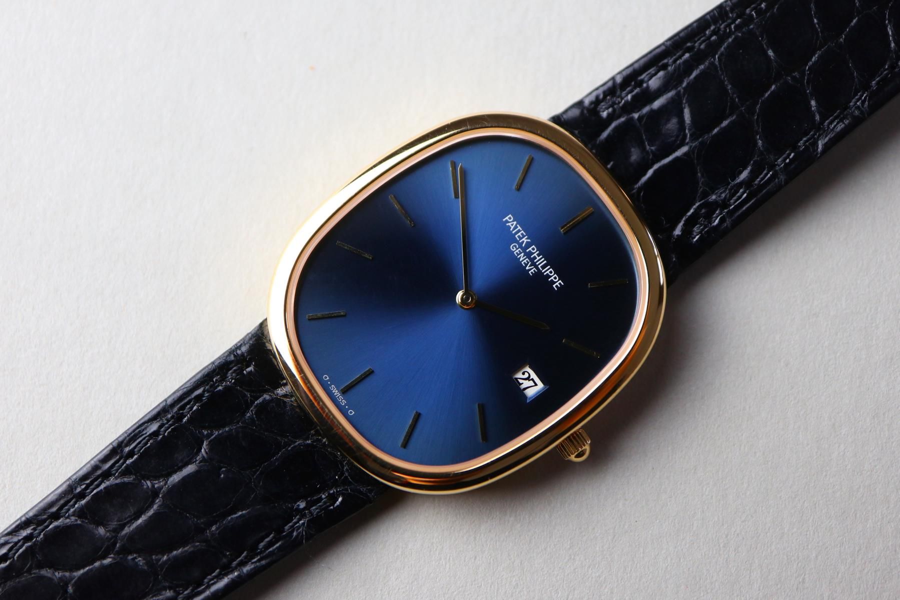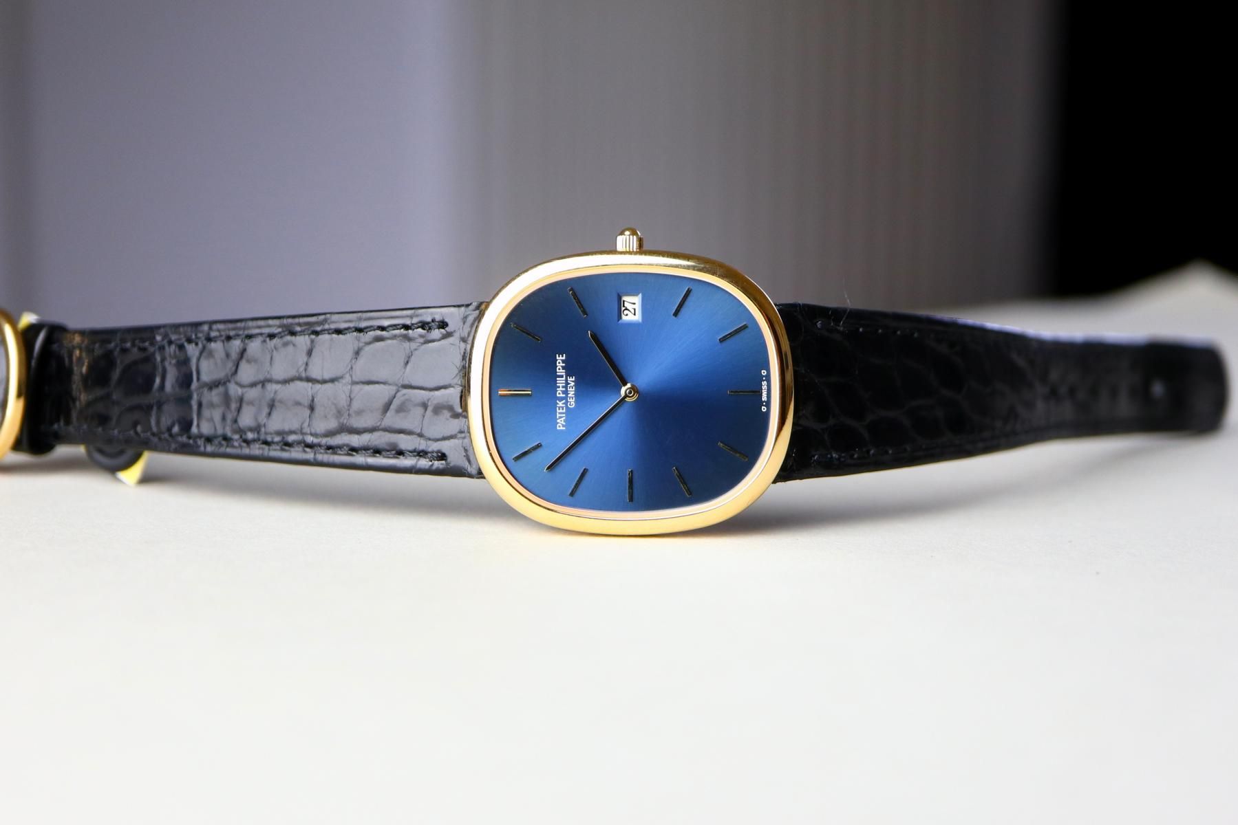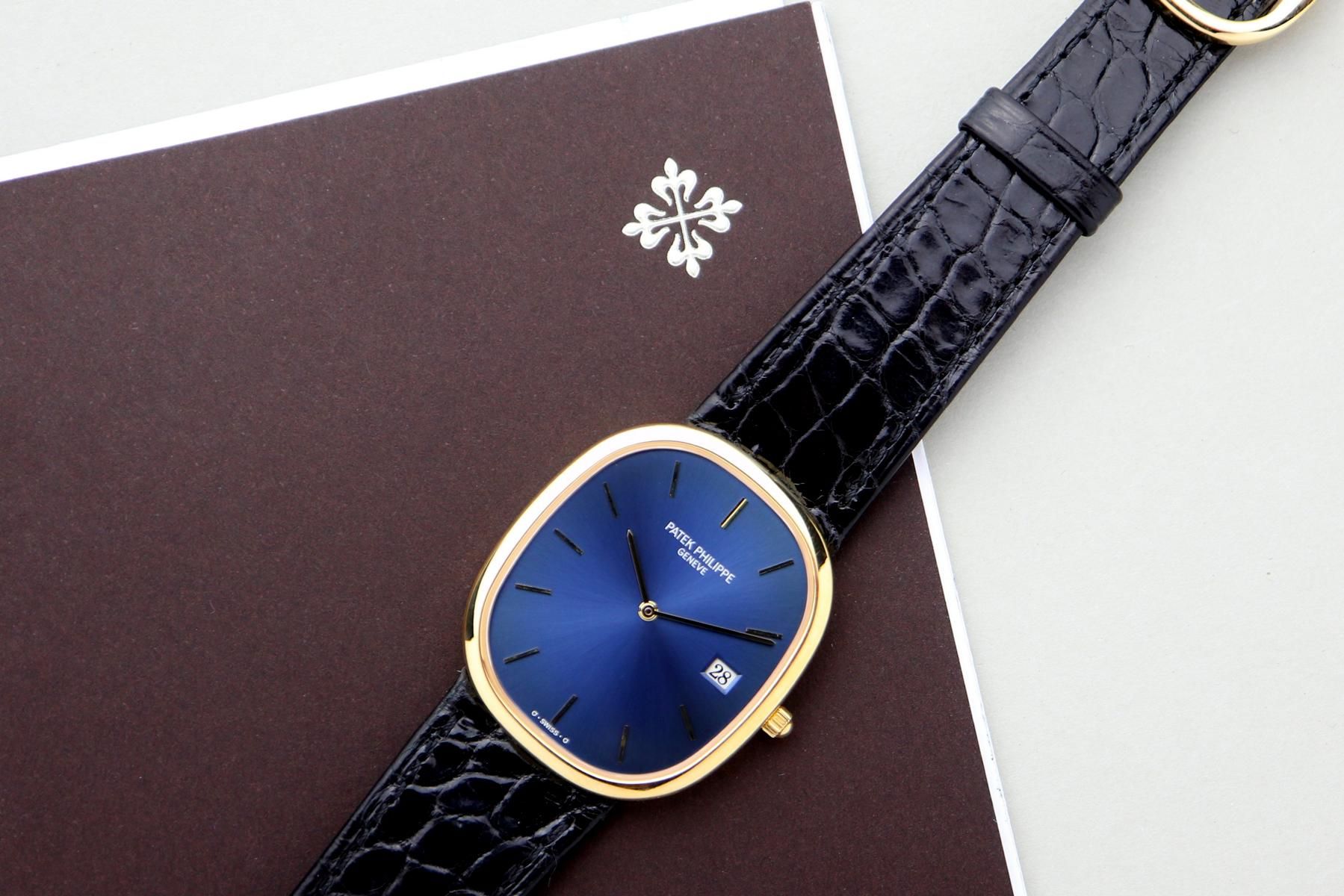 PATEK PHILIPPE Ellipse d’Or Ref. 3747 – “Jumbo Date” – 1980s PRICE: €14,400.00 DETAILS Brand: Patek Philippe Year: 1980s Model: Ellipse d’Or Jumbo Dat Material: 18k solid gold Movement: quartz Case diameter without crown: 31 x 35.5 mm Bracelet/Strap: Patek Philippe leather strap Service history: unknown, running well What you should know: unpolished, nice vintage condition, striking blue (“bleu”) sunburst dial ——— Wristclassics GmbH Brückengasse 1b, 78462 Konstanz, Germany WhatsApp: ‪+41 78 810 81 99‬ Email: info@wristclassics.com