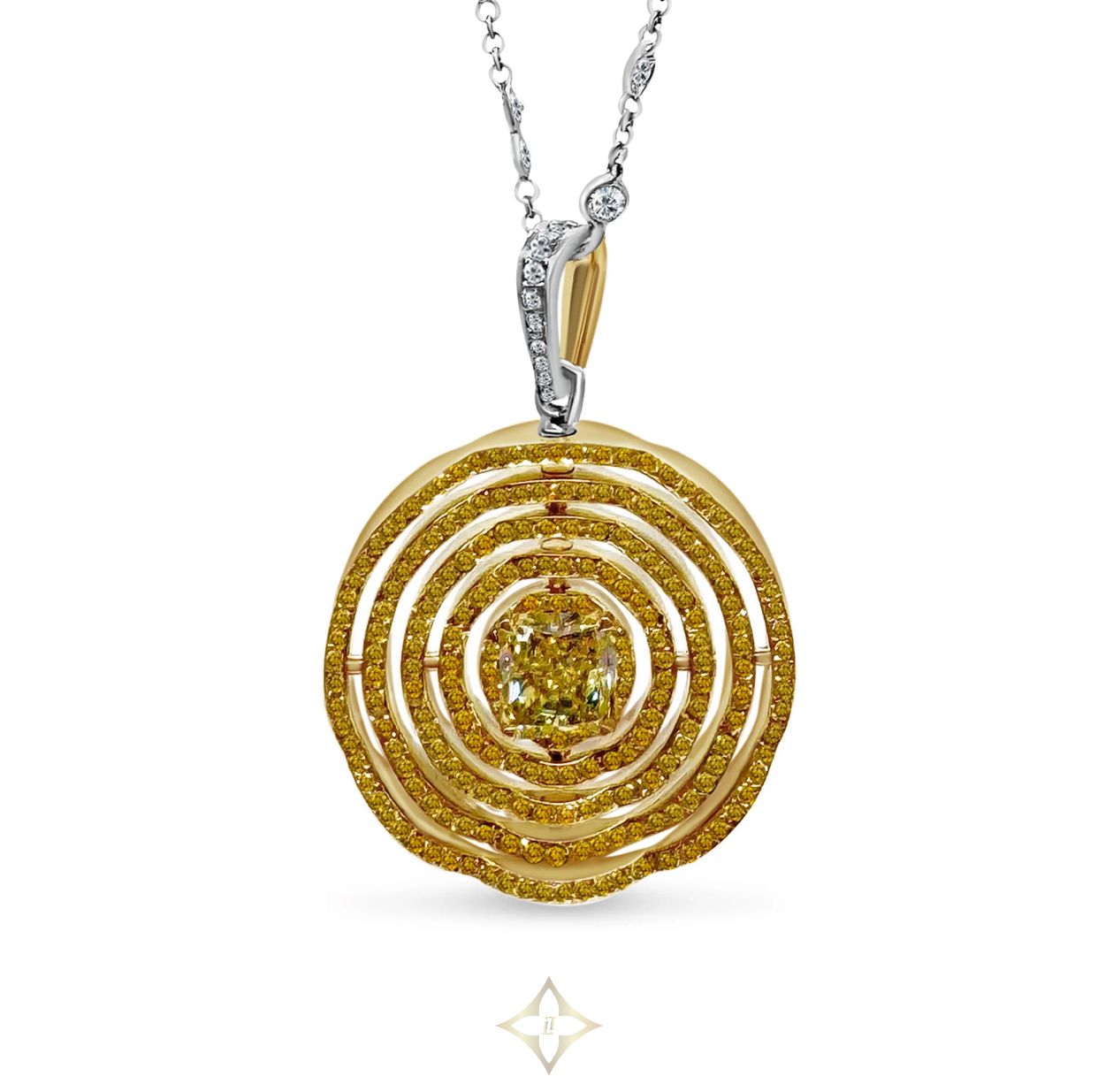 Original with white gold and its many white diamonds or more colorful with yellow gold paved with yellow diamonds, the pendant and its two faces highlight the sublime yellow diamond in its center. A rare creation, this unique pendant will suit every taste.