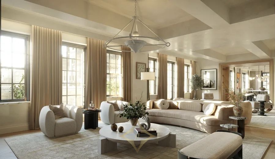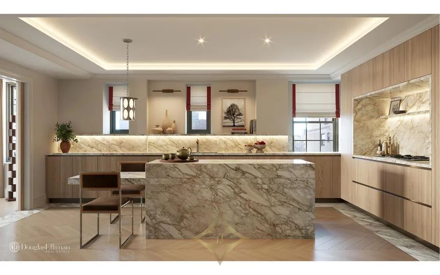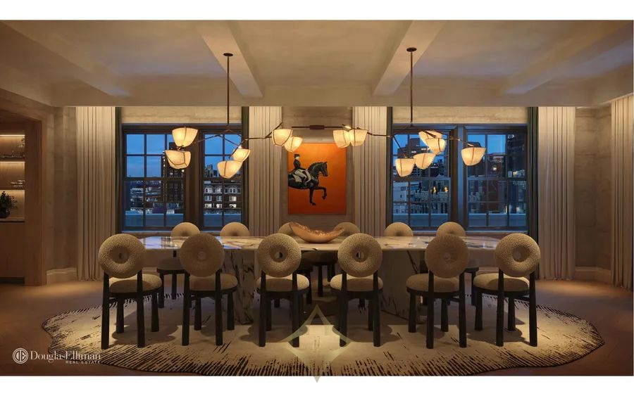 Penthouse 1 is an expansive duplex featuring three bedrooms, three bathrooms, three powder rooms, and three terraces. Spanning 5,195 interior square feet and 2,317 exterior square feet, it boasts North, East, South, and West exposures. The entry foyer, adorned with Calacatta Golden marble architraves and inset borders, leads to a 34-feet great room that connects to a formal dining room and a separate windowed eat-in kitchen. Throughout the home, 5-inch white oak flooring is meticulously laid in a sophisticated chevron pattern. The primary suite includes dual walk-in closets and a bright, windowed primary bathroom. The upper floor features a gracious 28-feet living room that opens to a spacious outdoor terrace.