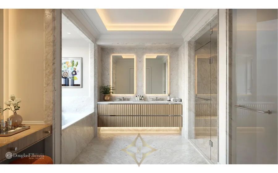 Secondary bathrooms are designed with equal opulence, featuring custom wall-mounted vanities with ribbed white oak drawer fronts and under-cabinet led lighting, along with linear sconces by Visual Comfort. The powder room features a custom-designed Vango Gold Extra marble floating vanity with under counter illumination and floor to ceiling mirror with bronze trim.