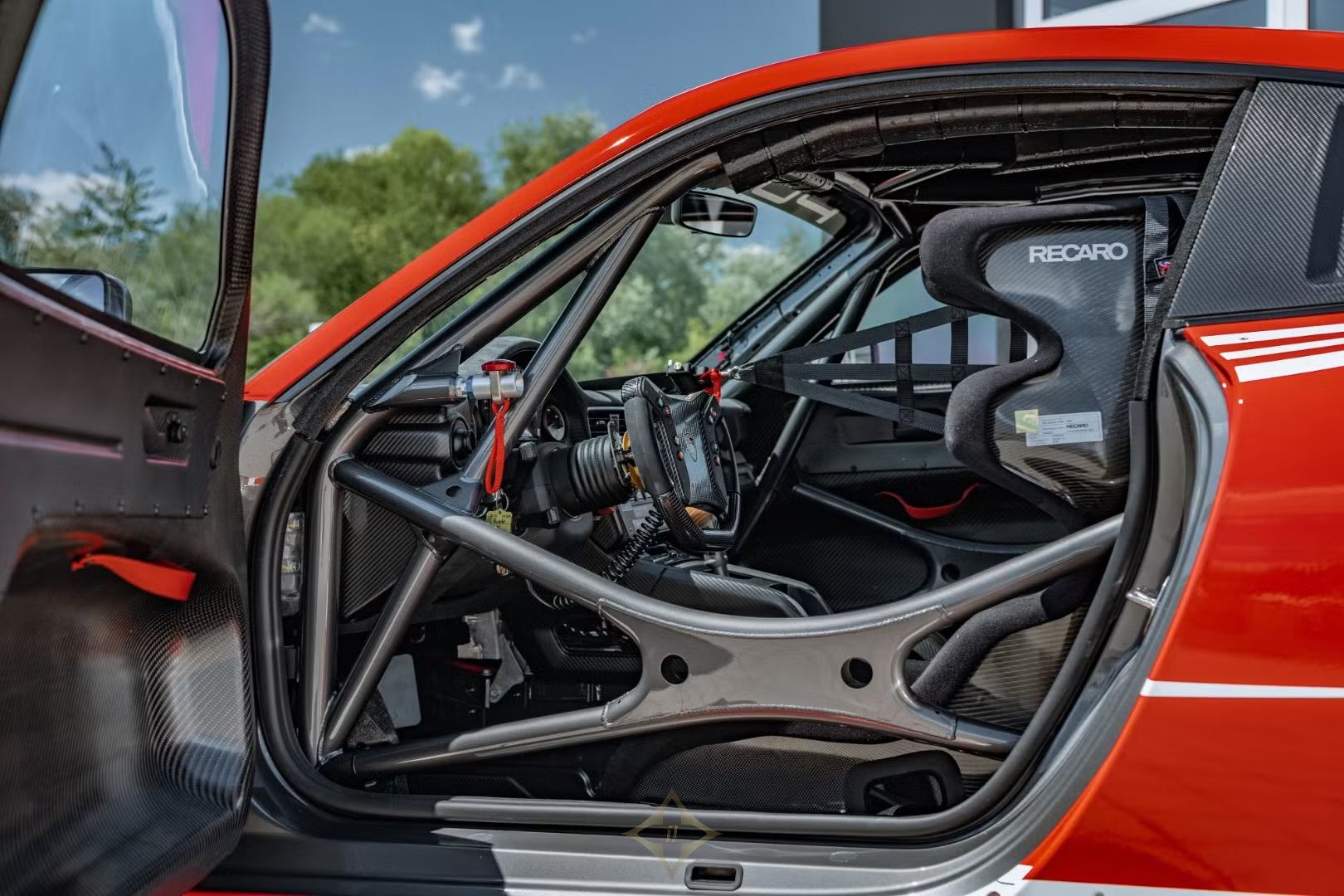 Additional highlights are the onboard air jacks facilitating rapid tire changes during pit stops, tire pressure monitoring system (TPMS), air conditioning system designed for racing conditions, and central locking system tailored to motorsport needs. The cockpit offers analog boost pressure indicators alongside digital Cosworth ICD displays with data logging capabilities. Interior trims combine Alcantara® fabric with carbon fiber reinforced polymer (CFRP) parts to reduce weight while maintaining driver comfort.