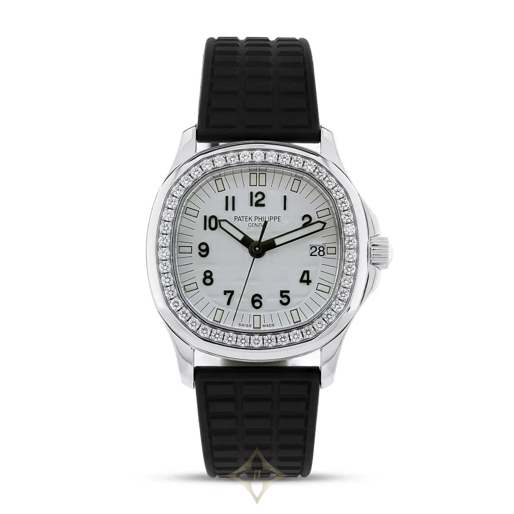 Pre-Owned Patek Philippe 5067A-011 Steel Aquanaut with white arabic dial diamond set bezel on black rubber strap.