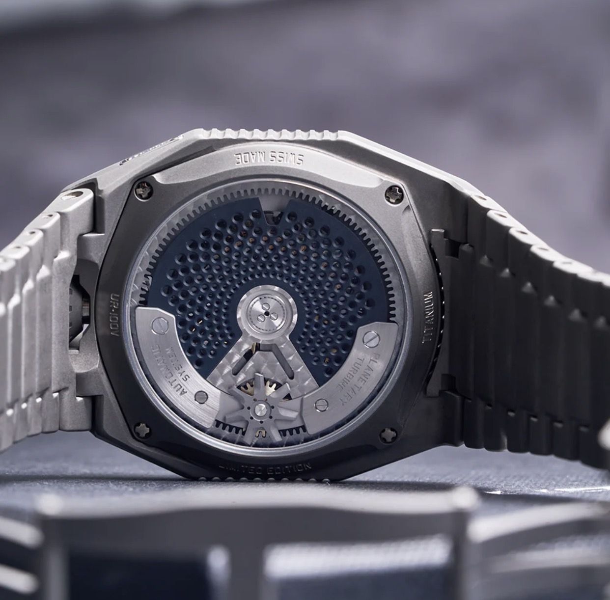 This stunning timepiece combines elegance and functionality, with its luminous and intense metallic grey color that gleams under the light. Made entirely of titanium, it features a complex 3D dial that adds structure and legibility to the watch.