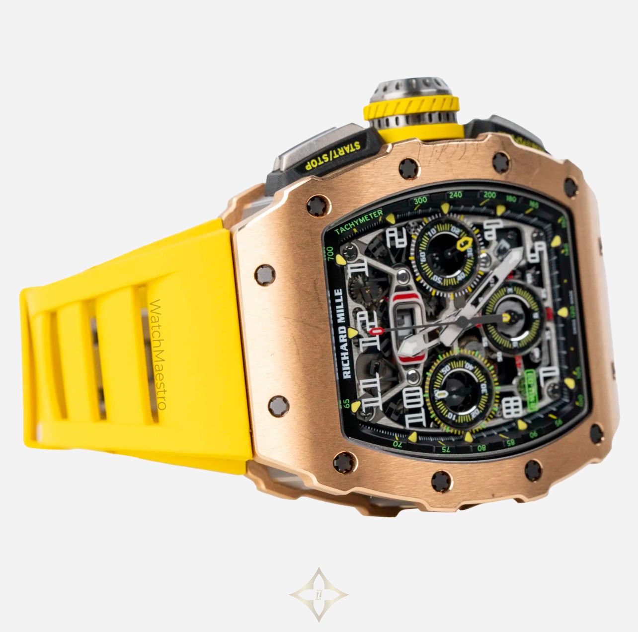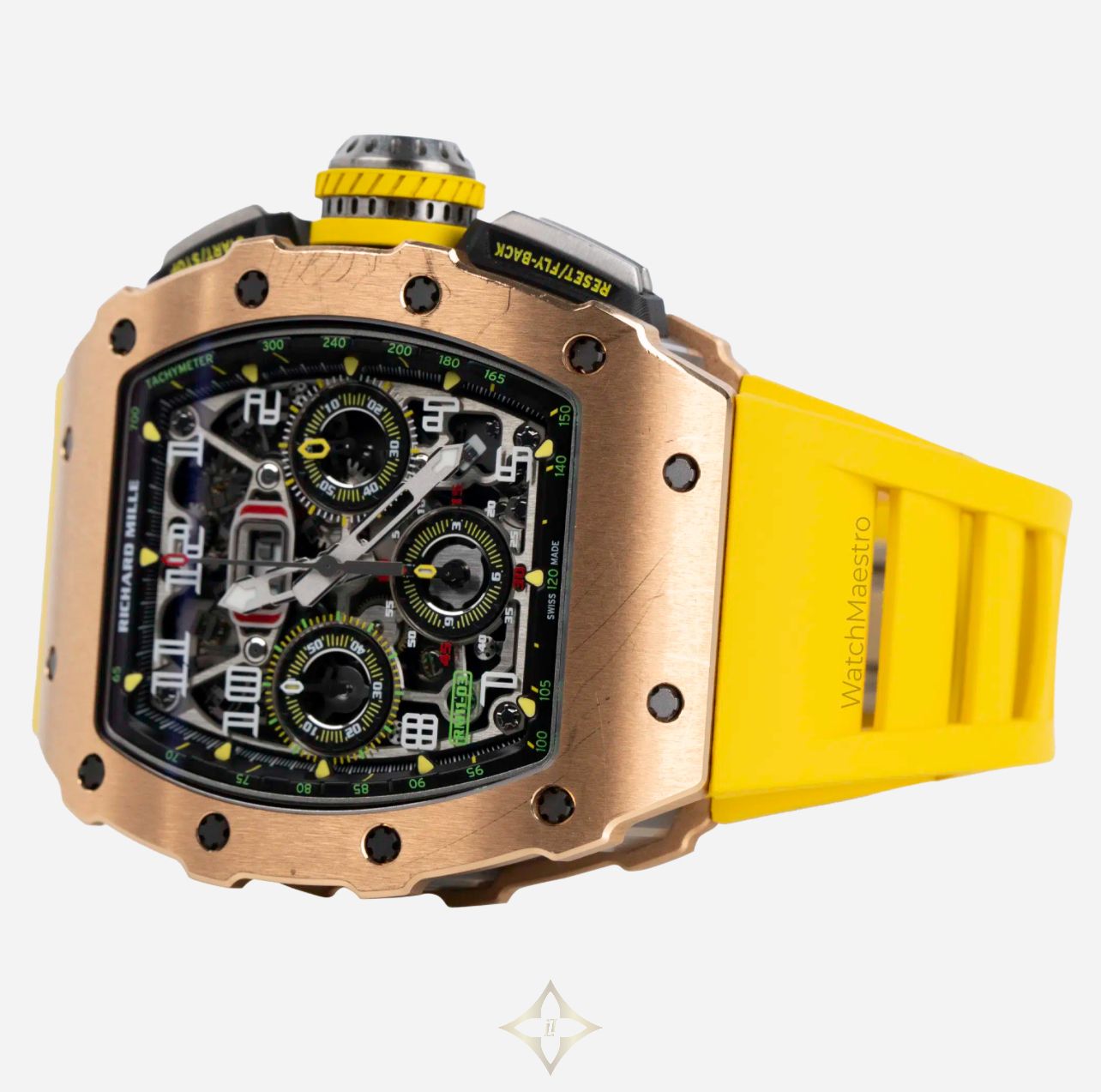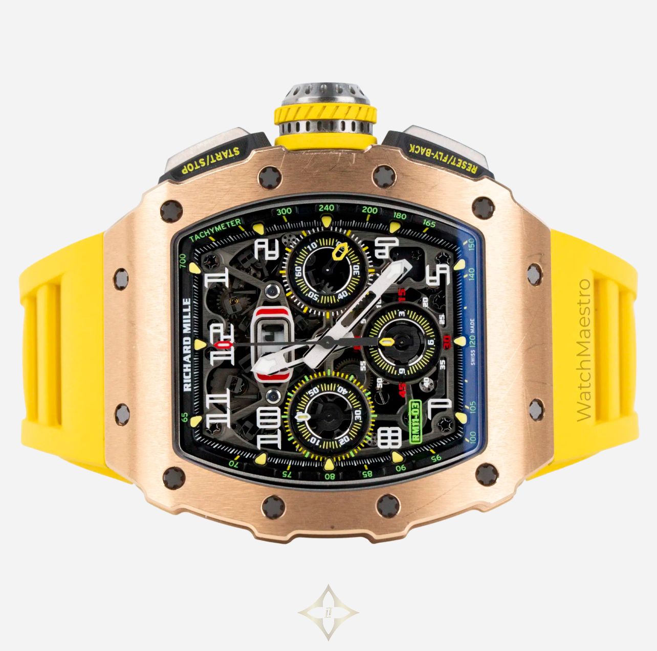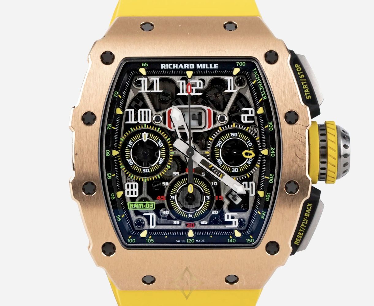 WatchMaestro presents you the bold and stunning Richard Mille RM 11-03 in Rose Gold. This striking timepiece features a Skeleton Dial with Bold Numerals, providing a captivating view of its intricate mechanical movement. Crafted in Rose Gold, the RM 11-03 is paired with a vibrant Yellow Rubber Strap, that will surely bring people’s attention towards your wrist. Its Automatic Flyback Chronograph function ensures precision and performance, making it a standout in both style and functionality. Originally purchased in 2017, the watch is presented in pre-owned, good condition. This exceptional watch comes complete with its original box and papers, ensuring its authenticity and provenance.