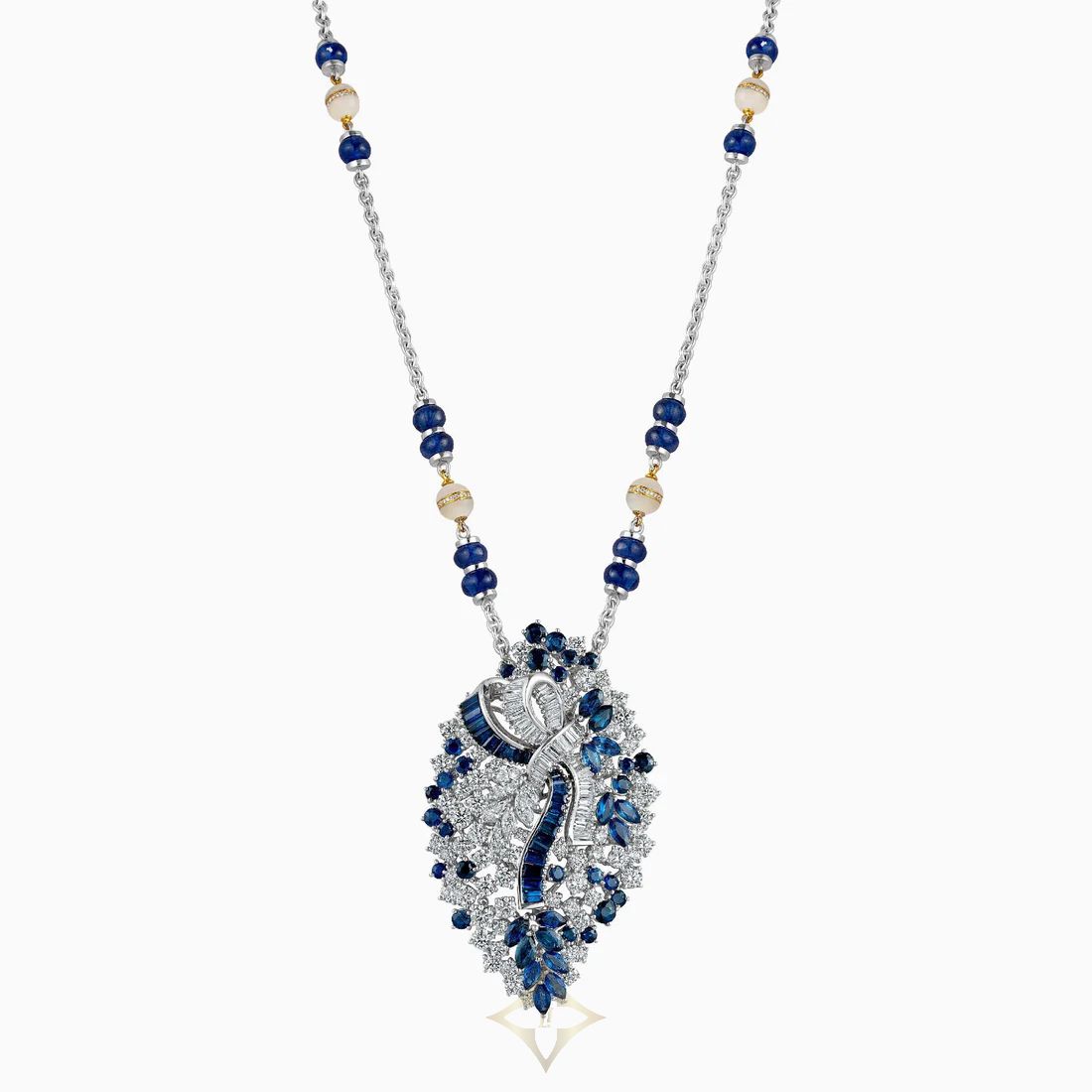 Sapphire and Diamond Pendant Crafted with intricate detail, this breathtaking pendant showcases the finest Ceylon sapphires and diamonds in various cuts, creating in a truly unique piece of jewellery. PRICE: $44,500.00 Product Details Technical Information Sapphires 50.03 carats (Round, Baguettes, Marquise, and Pear shaped) Marquise, Round, and Taper shaped diamonds 10.7 carats, E/H color, VVS1 VS2 clarity Mother of pearl Small brilliant diamonds 0.20 carats 18 Karat white gold Reference: DPN08249 ——— Aliel Jewellers Phone: +971 50 550 4517 WhatsApp: +971 56 336 9299 Email: enquiries@aliel.com SHOWROOM LOCATION * U.A.E. Dubai Khalil Al Sayegh Jewellers Al Maktoum Street Deira, P.O.Box 3112, Dubai, UAE Phone: +9714 2217999 Email: info@aliel.com * Pakistan, Lahore Shop # 51/64, Shopping Arcade, Pearl Continental Hotel, Mall Road, Lahore- Pakistan Phone: +92(42) 3636 2660 Email: lahore@aliel.com