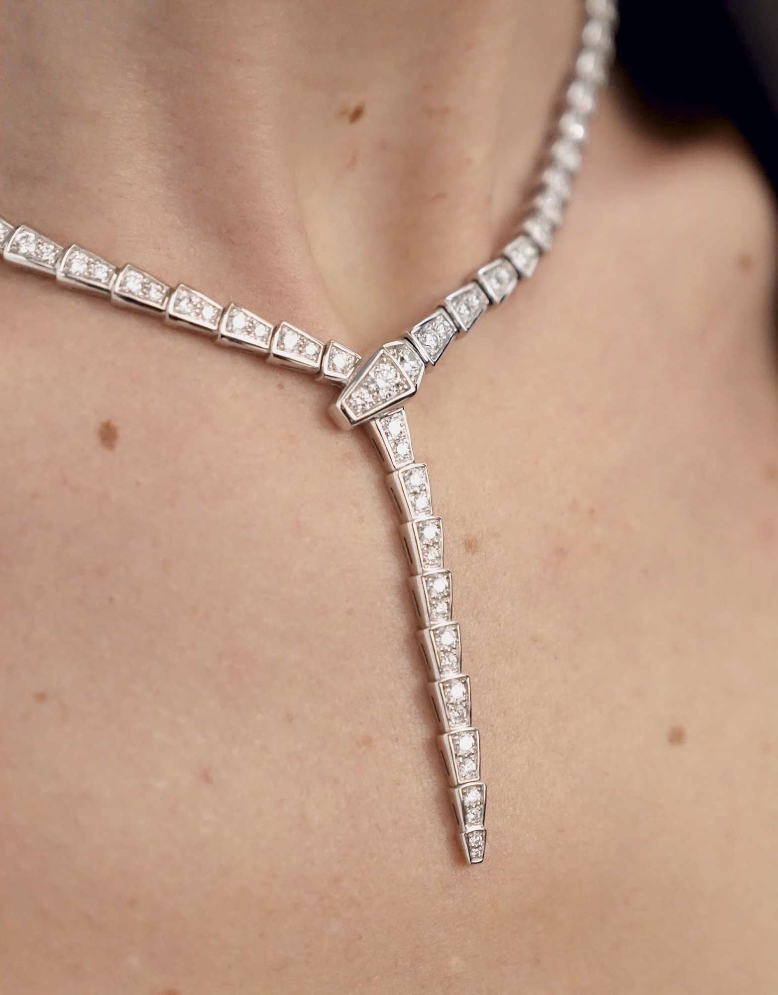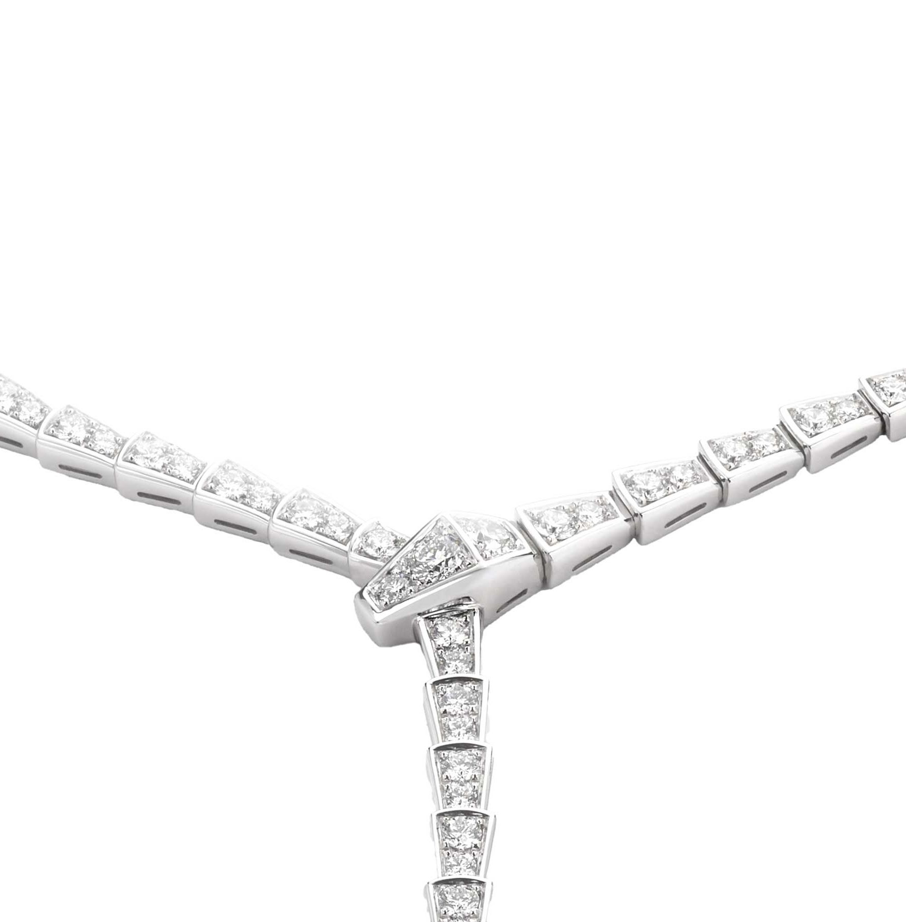 Serpenti Viper slim necklace in 18 kt white gold, set with full pavé diamonds. In a tribute to its spirit animal, Bulgari captures the power of seduction in this Serpenti Viper necklace, camouflaging sensuality and temptation with a hypnotic design. Sophisticated and glamorous, this jewel coils around the neck striking with the precious beauty of the scales and with the distinctive sinuosity of the snake.